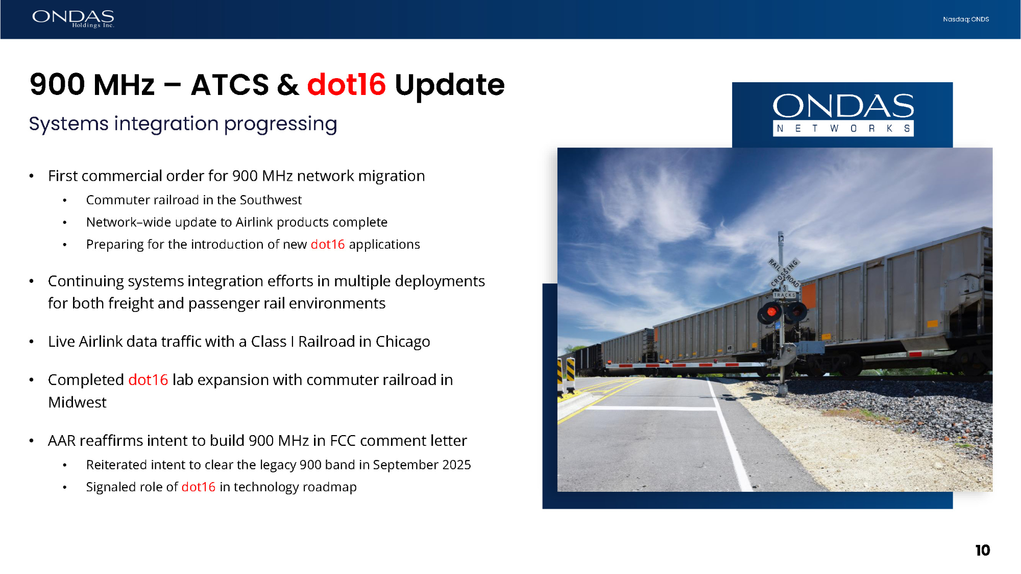 “At Ondas Networks, our distribution partner secured an initial commercial order for Airlink, powered by our FullMAX software defined networking platform, for Advanced Train Control Systems (ATCS) deployment in the 900 MHz network. This marks a major milestone following the successful installation and systems integration. Live Airlink networks are now operational for both a Class I freight rail operator and a transit customer while additional orders are expected in the second half of 2024 for similar area-wide buildouts. In parallel, we are engaging railroad customers to identify broad deployment plans in the 900 MHz network for 2025, though visibility around purchase order commitments remains limited in the near term. We continue to advance revenue-generating funded development programs, including the strategically important 220 MHz Positive Train Control (PTC) data radio development program designed for Amtrak and other transit and freight rail operators across the Northeast Corridor (NEC).