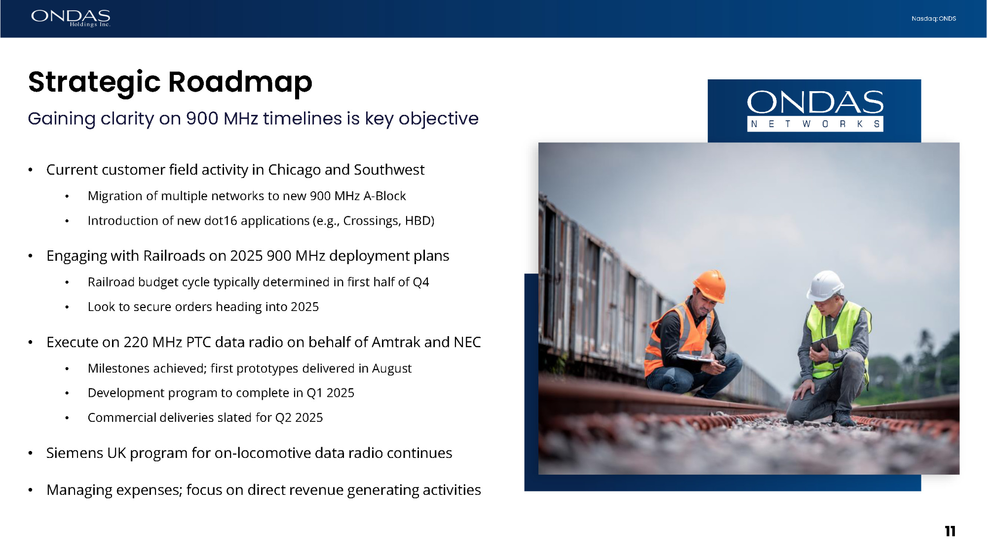 Nasdaq: ONDS 900 MHz – ATCS & dot16 Upd6te 10 Systems integration progressing • First commercial order for 900 MHz network migration • Commuter railroad in the Southwest • Network – wide update to Airlink products complete • Preparing for the introduction of new dot16 applications • Continuing systems integration efforts in multiple deployments for both freight and passenger rail environments • Live Airlink data traffic with a Class I Railroad in Chicago • Completed dot16 lab expansion with commuter railroad in Midwest • AAR reaffirms intent to build 900 MHz in FCC comment letter • Reiterated intent to clear the legacy 900 band in September 2025 • Signaled role of dot16 in technology roadmap