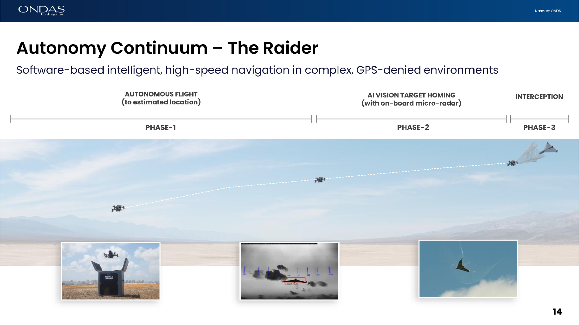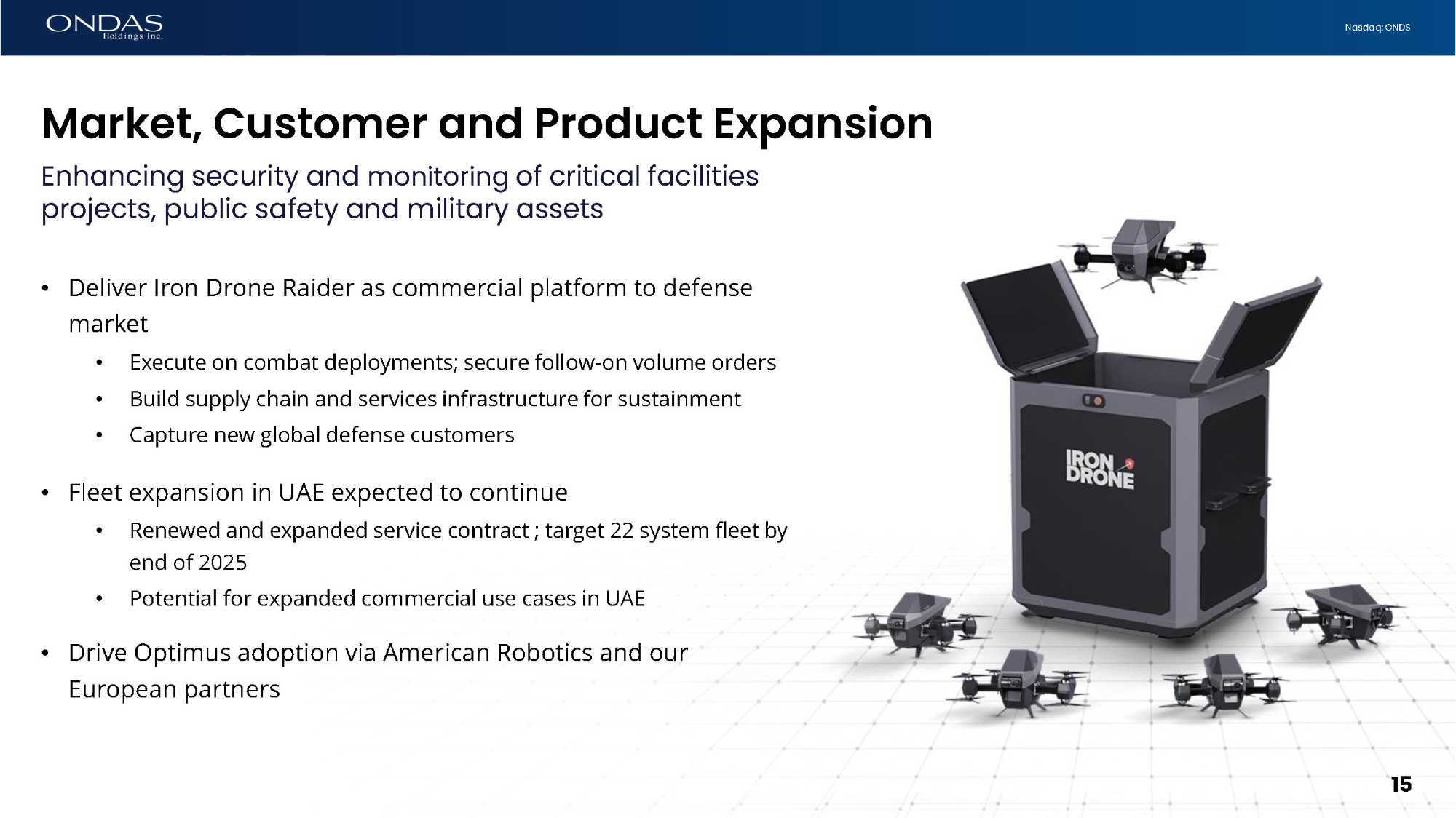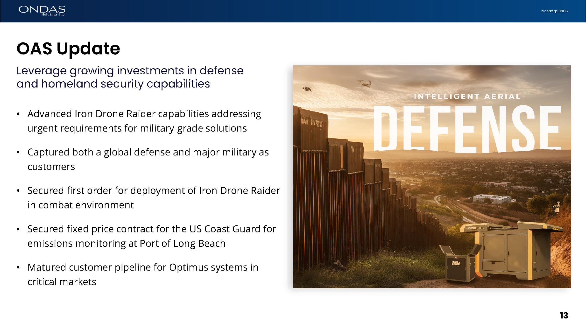 Nasdaq: ONDS OAS Upd6te 13 Leverage growing investments in defense and homeland security capabilities • Advanced Iron Drone Raider capabilities addressing urgent requirements for military - grade solutions • Captured both a global defense and major military as customers • Secured first order for deployment of Iron Drone Raider in combat environment • Secured fixed price contract for the US Coast Guard for emissions monitoring at Port of Long Beach • Matured customer pipeline for Optimus systems in critical markets