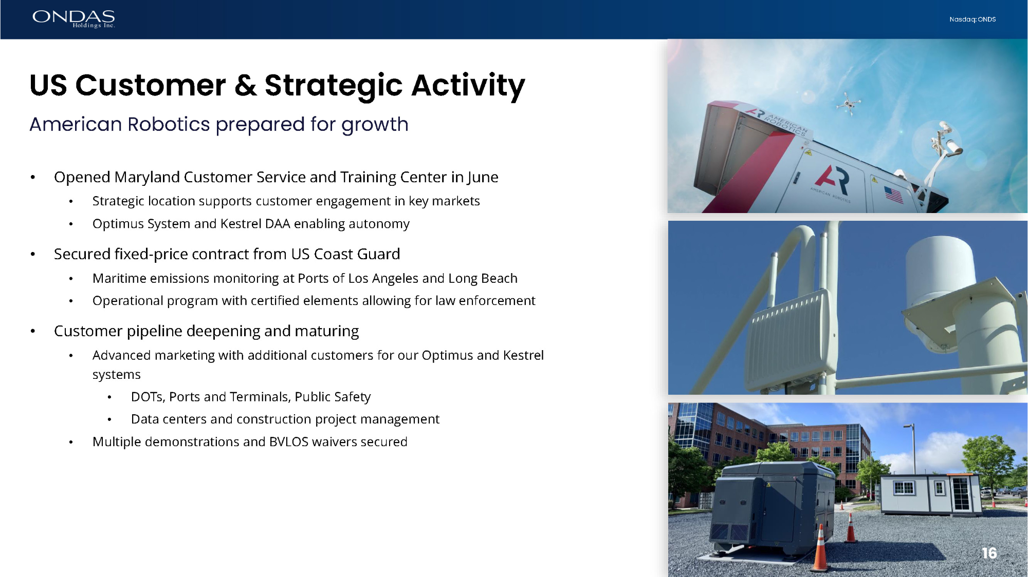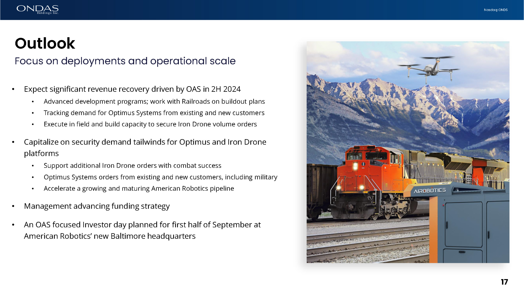 Nasdaq: ONDS US Customer & Str6tegic Activity 15 16 American Robotics prepared for growth • Opened Maryland Customer Service and Training Center in June • Strategic location supports customer engagement in key markets • Optimus System and Kestrel DAA enabling autonomy • Secured fixed - price contract from US Coast Guard • Maritime emissions monitoring at Ports of Los Angeles and Long Beach • Operational program with certified elements allowing for law enforcement • Customer pipeline deepening and maturing • Advanced marketing with additional customers for our Optimus and Kestrel systems • DOTs, Ports and Terminals, Public Safety • Data centers and construction project management • Multiple demonstrations and BVLOS waivers secured
