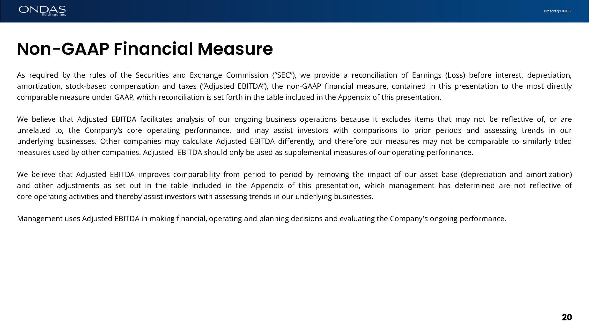 20 Nasdaq: ONDS As required by the rules of the Securities and Exchange Commission (“SEC”), we provide a reconciliation of Earnings (Loss) before interest, depreciation, amortization, stock - based compensation and taxes (“Adjusted EBITDA”), the non - GAAP financial measure, contained in this presentation to the most directly comparable measure under GAAP, which reconciliation is set forth in the table included in the Appendix of this presentation . We believe that Adjusted EBITDA facilitates analysis of our ongoing business operations because it excludes items that may not be reflective of, or are unrelated to, the Company’s core operating performance, and may assist investors with comparisons to prior periods and assessing trends in our underlying businesses . Other companies may calculate Adjusted EBITDA differently, and therefore our measures may not be comparable to similarly titled measures used by other companies . Adjusted EBITDA should only be used as supplemental measures of our operating performance . We believe that Adjusted EBITDA improves comparability from period to period by removing the impact of our asset base (depreciation and amortization) and other adjustments as set out in the table included in the Appendix of this presentation, which management has determined are not reflective of core operating activities and thereby assist investors with assessing trends in our underlying businesses . Management uses Adjusted EBITDA in making financial, operating and planning decisions and evaluating the Company's ongoing performance . Nofi - GAAP Fifi6fici6l Me6sure