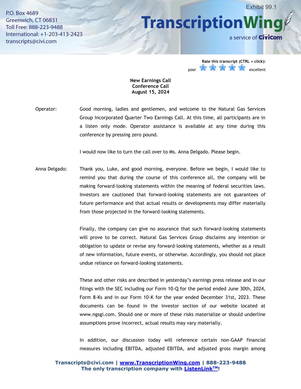 Transcripts@civi.com | www.TranscriptionWing.com | 888-223-9488 The only transcription company with ListenLinkTM! Rate this transcript (CTRL + click): poor excellent New Earnings Call Conference Call August 15, 2024 Operator: Good morning, ladies and gentlemen, and welcome to the Natural Gas Services Group Incorporated Quarter Two Earnings Call. At this time, all participants are in a listen only mode. Operator assistance is available at any time during this conference by pressing zero pound. I would now like to turn the call over to Ms. Anna Delgado. Please begin. Anna Delgado: Thank you, Luke, and good morning, everyone. Before we begin, I would like to remind you that during the course of this conference all, the company will be making forward-looking statements within the meaning of federal securities laws. Investors are cautioned that forward-looking statements are not guarantees of future performance and that actual results or developments may differ materially from those projected in the forward-looking statements. Finally, the company can give no assurance that such forward-looking statements will prove to be correct. Natural Gas Services Group disclaims any intention or obligation to update or revise any forward-looking statements, whether as a result of new information, future events, or otherwise. Accordingly, you should not place undue reliance on forward-looking statements. These and other risks are described in yesterday’s earnings press release and in our filings with the SEC including our Form 10-Q for the period ended June 30th, 2024, Form 8-Ks and in our Form 10-K for the year ended December 31st, 2023. These documents can be found in the investor section of our website located at www.ngsgi.com. Should one or more of these risks materialize or should underline assumptions prove incorrect, actual results may vary materially. In addition, our discussion today will reference certain non-GAAP financial measures including EBITDA, adjusted EBITDA, and adjusted gross margin among Exhibit 99.1