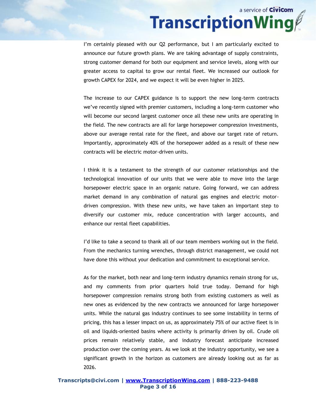 Transcripts@civi.com | www.TranscriptionWing.com | 888-223-9488 Page 3 of 16 I’m certainly pleased with our Q2 performance, but I am particularly excited to announce our future growth plans. We are taking advantage of supply constraints, strong customer demand for both our equipment and service levels, along with our greater access to capital to grow our rental fleet. We increased our outlook for growth CAPEX for 2024, and we expect it will be even higher in 2025. The increase to our CAPEX guidance is to support the new long-term contracts we’ve recently signed with premier customers, including a long-term customer who will become our second largest customer once all these new units are operating in the field. The new contracts are all for large horsepower compression investments, above our average rental rate for the fleet, and above our target rate of return. Importantly, approximately 40% of the horsepower added as a result of these new contracts will be electric motor-driven units. I think it is a testament to the strength of our customer relationships and the technological innovation of our units that we were able to move into the large horsepower electric space in an organic nature. Going forward, we can address market demand in any combination of natural gas engines and electric motor- driven compression. With these new units, we have taken an important step to diversify our customer mix, reduce concentration with larger accounts, and enhance our rental fleet capabilities. I’d like to take a second to thank all of our team members working out in the field. From the mechanics turning wrenches, through district management, we could not have done this without your dedication and commitment to exceptional service. As for the market, both near and long-term industry dynamics remain strong for us, and my comments from prior quarters hold true today. Demand for high horsepower compression remains strong both from existing customers as well as new ones as evidenced by the new contracts we announced for large horsepower units. While the natural gas industry continues to see some instability in terms of pricing, this has a lesser impact on us, as approximately 75% of our active fleet is in oil and liquids-oriented basins where activity is primarily driven by oil. Crude oil prices remain relatively stable, and industry forecast anticipate increased production over the coming years. As we look at the industry opportunity, we see a significant growth in the horizon as customers are already looking out as far as 2026.