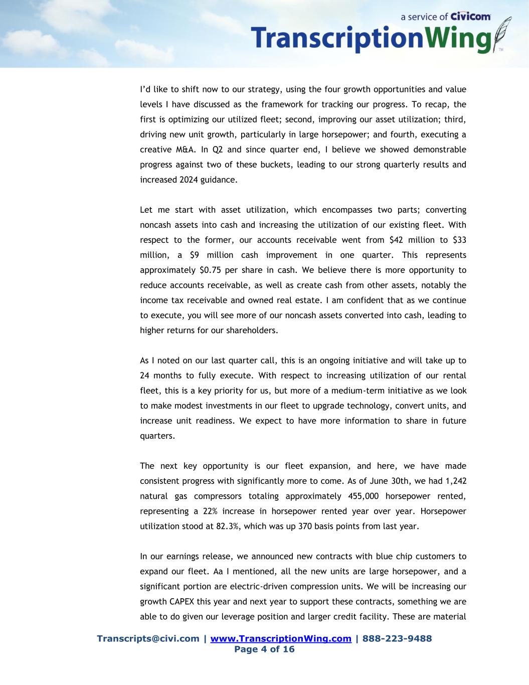 Transcripts@civi.com | www.TranscriptionWing.com | 888-223-9488 Page 4 of 16 I’d like to shift now to our strategy, using the four growth opportunities and value levels I have discussed as the framework for tracking our progress. To recap, the first is optimizing our utilized fleet; second, improving our asset utilization; third, driving new unit growth, particularly in large horsepower; and fourth, executing a creative M&A. In Q2 and since quarter end, I believe we showed demonstrable progress against two of these buckets, leading to our strong quarterly results and increased 2024 guidance. Let me start with asset utilization, which encompasses two parts; converting noncash assets into cash and increasing the utilization of our existing fleet. With respect to the former, our accounts receivable went from $42 million to $33 million, a $9 million cash improvement in one quarter. This represents approximately $0.75 per share in cash. We believe there is more opportunity to reduce accounts receivable, as well as create cash from other assets, notably the income tax receivable and owned real estate. I am confident that as we continue to execute, you will see more of our noncash assets converted into cash, leading to higher returns for our shareholders. As I noted on our last quarter call, this is an ongoing initiative and will take up to 24 months to fully execute. With respect to increasing utilization of our rental fleet, this is a key priority for us, but more of a medium-term initiative as we look to make modest investments in our fleet to upgrade technology, convert units, and increase unit readiness. We expect to have more information to share in future quarters. The next key opportunity is our fleet expansion, and here, we have made consistent progress with significantly more to come. As of June 30th, we had 1,242 natural gas compressors totaling approximately 455,000 horsepower rented, representing a 22% increase in horsepower rented year over year. Horsepower utilization stood at 82.3%, which was up 370 basis points from last year. In our earnings release, we announced new contracts with blue chip customers to expand our fleet. Aa I mentioned, all the new units are large horsepower, and a significant portion are electric-driven compression units. We will be increasing our growth CAPEX this year and next year to support these contracts, something we are able to do given our leverage position and larger credit facility. These are material