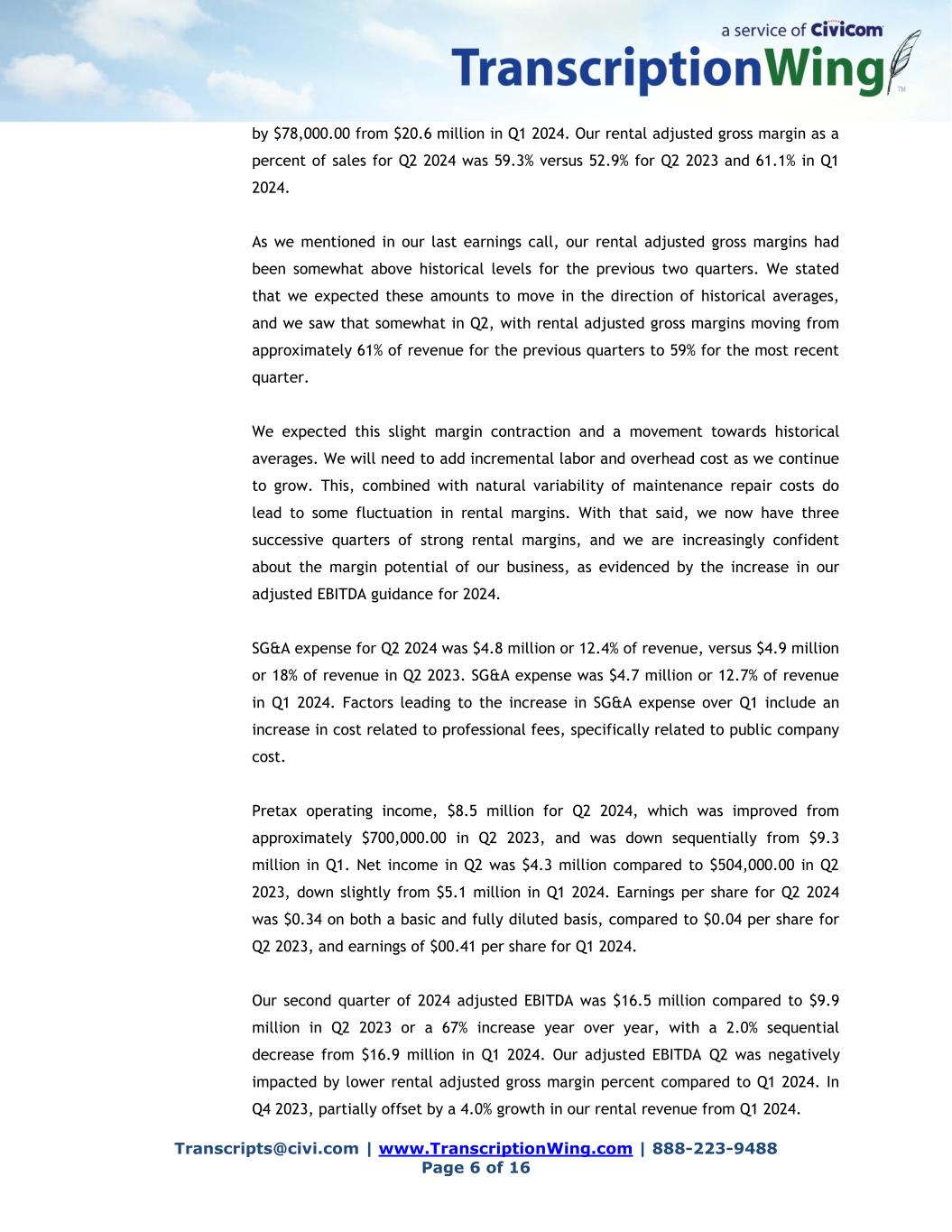 Transcripts@civi.com | www.TranscriptionWing.com | 888-223-9488 Page 6 of 16 by $78,000.00 from $20.6 million in Q1 2024. Our rental adjusted gross margin as a percent of sales for Q2 2024 was 59.3% versus 52.9% for Q2 2023 and 61.1% in Q1 2024. As we mentioned in our last earnings call, our rental adjusted gross margins had been somewhat above historical levels for the previous two quarters. We stated that we expected these amounts to move in the direction of historical averages, and we saw that somewhat in Q2, with rental adjusted gross margins moving from approximately 61% of revenue for the previous quarters to 59% for the most recent quarter. We expected this slight margin contraction and a movement towards historical averages. We will need to add incremental labor and overhead cost as we continue to grow. This, combined with natural variability of maintenance repair costs do lead to some fluctuation in rental margins. With that said, we now have three successive quarters of strong rental margins, and we are increasingly confident about the margin potential of our business, as evidenced by the increase in our adjusted EBITDA guidance for 2024. SG&A expense for Q2 2024 was $4.8 million or 12.4% of revenue, versus $4.9 million or 18% of revenue in Q2 2023. SG&A expense was $4.7 million or 12.7% of revenue in Q1 2024. Factors leading to the increase in SG&A expense over Q1 include an increase in cost related to professional fees, specifically related to public company cost. Pretax operating income, $8.5 million for Q2 2024, which was improved from approximately $700,000.00 in Q2 2023, and was down sequentially from $9.3 million in Q1. Net income in Q2 was $4.3 million compared to $504,000.00 in Q2 2023, down slightly from $5.1 million in Q1 2024. Earnings per share for Q2 2024 was $0.34 on both a basic and fully diluted basis, compared to $0.04 per share for Q2 2023, and earnings of $00.41 per share for Q1 2024. Our second quarter of 2024 adjusted EBITDA was $16.5 million compared to $9.9 million in Q2 2023 or a 67% increase year over year, with a 2.0% sequential decrease from $16.9 million in Q1 2024. Our adjusted EBITDA Q2 was negatively impacted by lower rental adjusted gross margin percent compared to Q1 2024. In Q4 2023, partially offset by a 4.0% growth in our rental revenue from Q1 2024.
