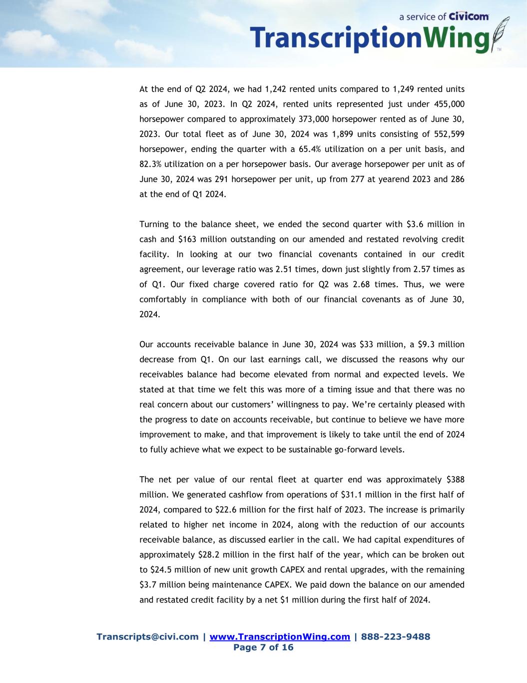 Transcripts@civi.com | www.TranscriptionWing.com | 888-223-9488 Page 7 of 16 At the end of Q2 2024, we had 1,242 rented units compared to 1,249 rented units as of June 30, 2023. In Q2 2024, rented units represented just under 455,000 horsepower compared to approximately 373,000 horsepower rented as of June 30, 2023. Our total fleet as of June 30, 2024 was 1,899 units consisting of 552,599 horsepower, ending the quarter with a 65.4% utilization on a per unit basis, and 82.3% utilization on a per horsepower basis. Our average horsepower per unit as of June 30, 2024 was 291 horsepower per unit, up from 277 at yearend 2023 and 286 at the end of Q1 2024. Turning to the balance sheet, we ended the second quarter with $3.6 million in cash and $163 million outstanding on our amended and restated revolving credit facility. In looking at our two financial covenants contained in our credit agreement, our leverage ratio was 2.51 times, down just slightly from 2.57 times as of Q1. Our fixed charge covered ratio for Q2 was 2.68 times. Thus, we were comfortably in compliance with both of our financial covenants as of June 30, 2024. Our accounts receivable balance in June 30, 2024 was $33 million, a $9.3 million decrease from Q1. On our last earnings call, we discussed the reasons why our receivables balance had become elevated from normal and expected levels. We stated at that time we felt this was more of a timing issue and that there was no real concern about our customers’ willingness to pay. We’re certainly pleased with the progress to date on accounts receivable, but continue to believe we have more improvement to make, and that improvement is likely to take until the end of 2024 to fully achieve what we expect to be sustainable go-forward levels. The net per value of our rental fleet at quarter end was approximately $388 million. We generated cashflow from operations of $31.1 million in the first half of 2024, compared to $22.6 million for the first half of 2023. The increase is primarily related to higher net income in 2024, along with the reduction of our accounts receivable balance, as discussed earlier in the call. We had capital expenditures of approximately $28.2 million in the first half of the year, which can be broken out to $24.5 million of new unit growth CAPEX and rental upgrades, with the remaining $3.7 million being maintenance CAPEX. We paid down the balance on our amended and restated credit facility by a net $1 million during the first half of 2024.