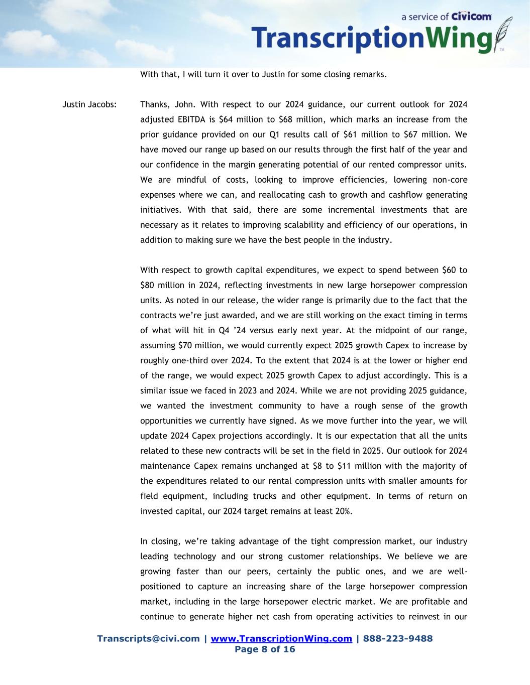 Transcripts@civi.com | www.TranscriptionWing.com | 888-223-9488 Page 8 of 16 With that, I will turn it over to Justin for some closing remarks. Justin Jacobs: Thanks, John. With respect to our 2024 guidance, our current outlook for 2024 adjusted EBITDA is $64 million to $68 million, which marks an increase from the prior guidance provided on our Q1 results call of $61 million to $67 million. We have moved our range up based on our results through the first half of the year and our confidence in the margin generating potential of our rented compressor units. We are mindful of costs, looking to improve efficiencies, lowering non-core expenses where we can, and reallocating cash to growth and cashflow generating initiatives. With that said, there are some incremental investments that are necessary as it relates to improving scalability and efficiency of our operations, in addition to making sure we have the best people in the industry. With respect to growth capital expenditures, we expect to spend between $60 to $80 million in 2024, reflecting investments in new large horsepower compression units. As noted in our release, the wider range is primarily due to the fact that the contracts we’re just awarded, and we are still working on the exact timing in terms of what will hit in Q4 ’24 versus early next year. At the midpoint of our range, assuming $70 million, we would currently expect 2025 growth Capex to increase by roughly one-third over 2024. To the extent that 2024 is at the lower or higher end of the range, we would expect 2025 growth Capex to adjust accordingly. This is a similar issue we faced in 2023 and 2024. While we are not providing 2025 guidance, we wanted the investment community to have a rough sense of the growth opportunities we currently have signed. As we move further into the year, we will update 2024 Capex projections accordingly. It is our expectation that all the units related to these new contracts will be set in the field in 2025. Our outlook for 2024 maintenance Capex remains unchanged at $8 to $11 million with the majority of the expenditures related to our rental compression units with smaller amounts for field equipment, including trucks and other equipment. In terms of return on invested capital, our 2024 target remains at least 20%. In closing, we’re taking advantage of the tight compression market, our industry leading technology and our strong customer relationships. We believe we are growing faster than our peers, certainly the public ones, and we are well- positioned to capture an increasing share of the large horsepower compression market, including in the large horsepower electric market. We are profitable and continue to generate higher net cash from operating activities to reinvest in our