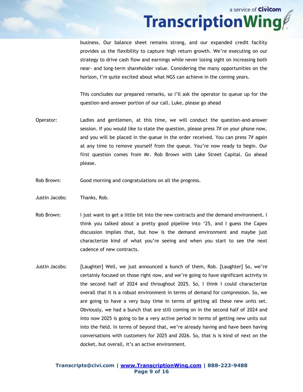 Transcripts@civi.com | www.TranscriptionWing.com | 888-223-9488 Page 9 of 16 business. Our balance sheet remains strong, and our expanded credit facility provides us the flexibility to capture high return growth. We’re executing on our strategy to drive cash flow and earnings while never losing sight on increasing both near- and long-term shareholder value. Considering the many opportunities on the horizon, I’m quite excited about what NGS can achieve in the coming years. This concludes our prepared remarks, so I’ll ask the operator to queue up for the question-and-answer portion of our call. Luke, please go ahead Operator: Ladies and gentlemen, at this time, we will conduct the question-and-answer session. If you would like to state the question, please press 7# on your phone now, and you will be placed in the queue in the order received. You can press 7# again at any time to remove yourself from the queue. You’re now ready to begin. Our first question comes from Mr. Rob Brown with Lake Street Capital. Go ahead please. Rob Brown: Good morning and congratulations on all the progress. Justin Jacobs: Thanks, Rob. Rob Brown: I just want to get a little bit into the new contracts and the demand environment. I think you talked about a pretty good pipeline into ‘25, and I guess the Capex discussion implies that, but how is the demand environment and maybe just characterize kind of what you’re seeing and when you start to see the next cadence of new contracts. Justin Jacobs: [Laughter] Well, we just announced a bunch of them, Rob. [Laughter] So, we’re certainly focused on those right now, and we’re going to have significant activity in the second half of 2024 and throughout 2025. So, I think I could characterize overall that it is a robust environment in terms of demand for compression. So, we are going to have a very busy time in terms of getting all these new units set. Obviously, we had a bunch that are still coming on in the second half of 2024 and into now 2025 is going to be a very active period in terms of getting new units out into the field. In terms of beyond that, we’re already having and have been having conversations with customers for 2025 and 2026. So, that is is kind of next on the docket, but overall, it’s an active environment.