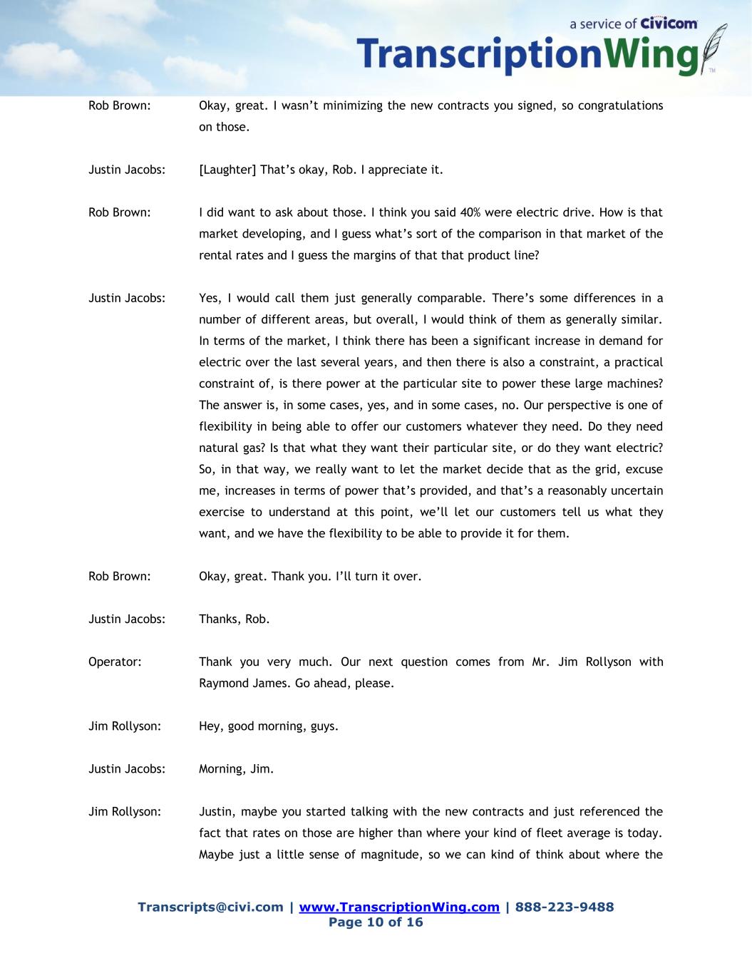 Transcripts@civi.com | www.TranscriptionWing.com | 888-223-9488 Page 10 of 16 Rob Brown: Okay, great. I wasn’t minimizing the new contracts you signed, so congratulations on those. Justin Jacobs: [Laughter] That’s okay, Rob. I appreciate it. Rob Brown: I did want to ask about those. I think you said 40% were electric drive. How is that market developing, and I guess what’s sort of the comparison in that market of the rental rates and I guess the margins of that that product line? Justin Jacobs: Yes, I would call them just generally comparable. There’s some differences in a number of different areas, but overall, I would think of them as generally similar. In terms of the market, I think there has been a significant increase in demand for electric over the last several years, and then there is also a constraint, a practical constraint of, is there power at the particular site to power these large machines? The answer is, in some cases, yes, and in some cases, no. Our perspective is one of flexibility in being able to offer our customers whatever they need. Do they need natural gas? Is that what they want their particular site, or do they want electric? So, in that way, we really want to let the market decide that as the grid, excuse me, increases in terms of power that’s provided, and that’s a reasonably uncertain exercise to understand at this point, we’ll let our customers tell us what they want, and we have the flexibility to be able to provide it for them. Rob Brown: Okay, great. Thank you. I’ll turn it over. Justin Jacobs: Thanks, Rob. Operator: Thank you very much. Our next question comes from Mr. Jim Rollyson with Raymond James. Go ahead, please. Jim Rollyson: Hey, good morning, guys. Justin Jacobs: Morning, Jim. Jim Rollyson: Justin, maybe you started talking with the new contracts and just referenced the fact that rates on those are higher than where your kind of fleet average is today. Maybe just a little sense of magnitude, so we can kind of think about where the