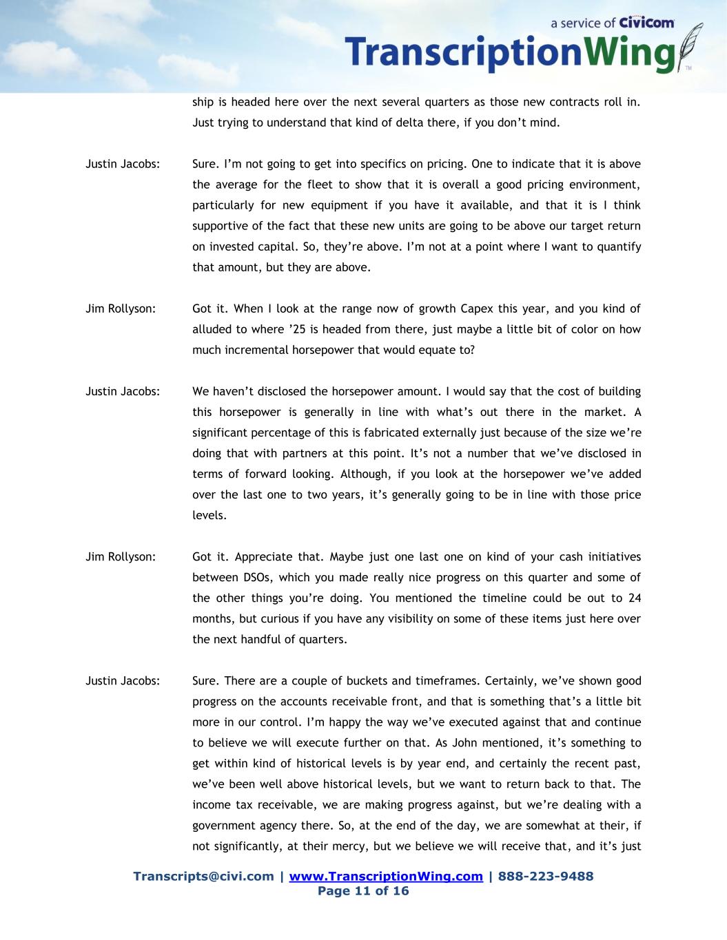 Transcripts@civi.com | www.TranscriptionWing.com | 888-223-9488 Page 11 of 16 ship is headed here over the next several quarters as those new contracts roll in. Just trying to understand that kind of delta there, if you don’t mind. Justin Jacobs: Sure. I’m not going to get into specifics on pricing. One to indicate that it is above the average for the fleet to show that it is overall a good pricing environment, particularly for new equipment if you have it available, and that it is I think supportive of the fact that these new units are going to be above our target return on invested capital. So, they’re above. I’m not at a point where I want to quantify that amount, but they are above. Jim Rollyson: Got it. When I look at the range now of growth Capex this year, and you kind of alluded to where ’25 is headed from there, just maybe a little bit of color on how much incremental horsepower that would equate to? Justin Jacobs: We haven’t disclosed the horsepower amount. I would say that the cost of building this horsepower is generally in line with what’s out there in the market. A significant percentage of this is fabricated externally just because of the size we’re doing that with partners at this point. It’s not a number that we’ve disclosed in terms of forward looking. Although, if you look at the horsepower we’ve added over the last one to two years, it’s generally going to be in line with those price levels. Jim Rollyson: Got it. Appreciate that. Maybe just one last one on kind of your cash initiatives between DSOs, which you made really nice progress on this quarter and some of the other things you’re doing. You mentioned the timeline could be out to 24 months, but curious if you have any visibility on some of these items just here over the next handful of quarters. Justin Jacobs: Sure. There are a couple of buckets and timeframes. Certainly, we’ve shown good progress on the accounts receivable front, and that is something that’s a little bit more in our control. I’m happy the way we’ve executed against that and continue to believe we will execute further on that. As John mentioned, it’s something to get within kind of historical levels is by year end, and certainly the recent past, we’ve been well above historical levels, but we want to return back to that. The income tax receivable, we are making progress against, but we’re dealing with a government agency there. So, at the end of the day, we are somewhat at their, if not significantly, at their mercy, but we believe we will receive that, and it’s just