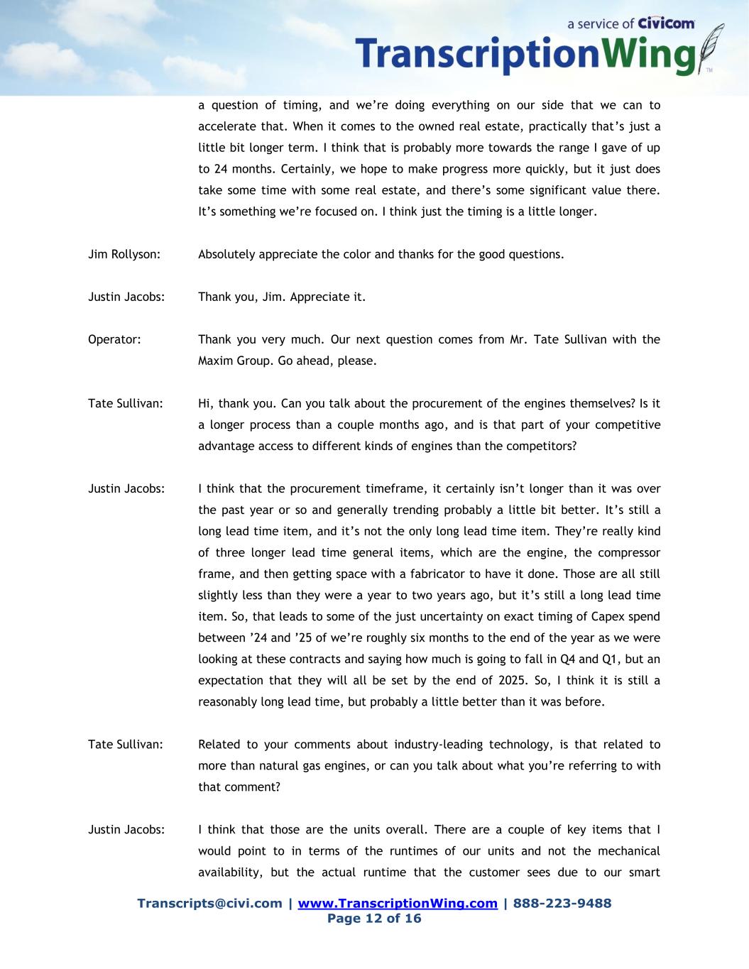 Transcripts@civi.com | www.TranscriptionWing.com | 888-223-9488 Page 12 of 16 a question of timing, and we’re doing everything on our side that we can to accelerate that. When it comes to the owned real estate, practically that’s just a little bit longer term. I think that is probably more towards the range I gave of up to 24 months. Certainly, we hope to make progress more quickly, but it just does take some time with some real estate, and there’s some significant value there. It’s something we’re focused on. I think just the timing is a little longer. Jim Rollyson: Absolutely appreciate the color and thanks for the good questions. Justin Jacobs: Thank you, Jim. Appreciate it. Operator: Thank you very much. Our next question comes from Mr. Tate Sullivan with the Maxim Group. Go ahead, please. Tate Sullivan: Hi, thank you. Can you talk about the procurement of the engines themselves? Is it a longer process than a couple months ago, and is that part of your competitive advantage access to different kinds of engines than the competitors? Justin Jacobs: I think that the procurement timeframe, it certainly isn’t longer than it was over the past year or so and generally trending probably a little bit better. It’s still a long lead time item, and it’s not the only long lead time item. They’re really kind of three longer lead time general items, which are the engine, the compressor frame, and then getting space with a fabricator to have it done. Those are all still slightly less than they were a year to two years ago, but it’s still a long lead time item. So, that leads to some of the just uncertainty on exact timing of Capex spend between ’24 and ’25 of we’re roughly six months to the end of the year as we were looking at these contracts and saying how much is going to fall in Q4 and Q1, but an expectation that they will all be set by the end of 2025. So, I think it is still a reasonably long lead time, but probably a little better than it was before. Tate Sullivan: Related to your comments about industry-leading technology, is that related to more than natural gas engines, or can you talk about what you’re referring to with that comment? Justin Jacobs: I think that those are the units overall. There are a couple of key items that I would point to in terms of the runtimes of our units and not the mechanical availability, but the actual runtime that the customer sees due to our smart