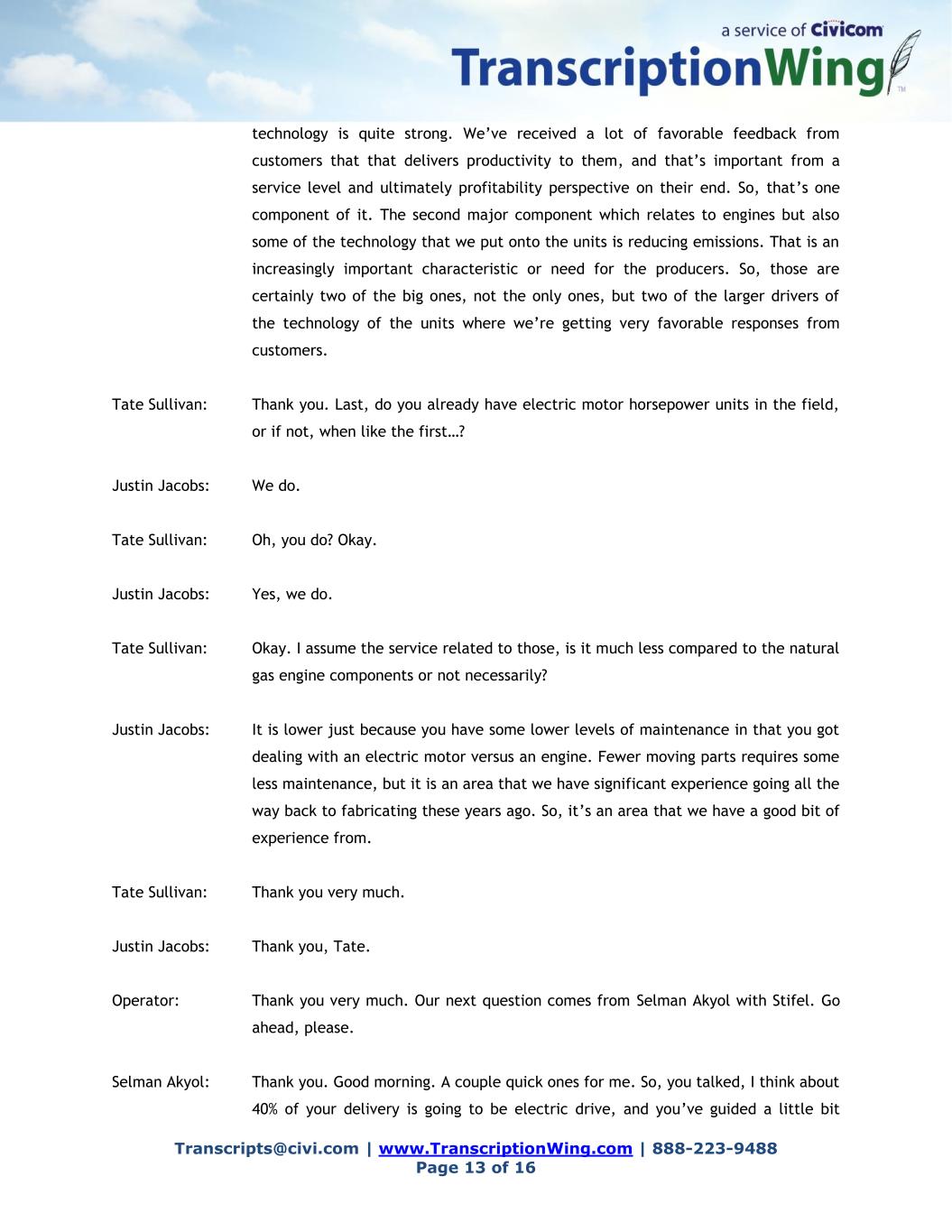 Transcripts@civi.com | www.TranscriptionWing.com | 888-223-9488 Page 13 of 16 technology is quite strong. We’ve received a lot of favorable feedback from customers that that delivers productivity to them, and that’s important from a service level and ultimately profitability perspective on their end. So, that’s one component of it. The second major component which relates to engines but also some of the technology that we put onto the units is reducing emissions. That is an increasingly important characteristic or need for the producers. So, those are certainly two of the big ones, not the only ones, but two of the larger drivers of the technology of the units where we’re getting very favorable responses from customers. Tate Sullivan: Thank you. Last, do you already have electric motor horsepower units in the field, or if not, when like the first…? Justin Jacobs: We do. Tate Sullivan: Oh, you do? Okay. Justin Jacobs: Yes, we do. Tate Sullivan: Okay. I assume the service related to those, is it much less compared to the natural gas engine components or not necessarily? Justin Jacobs: It is lower just because you have some lower levels of maintenance in that you got dealing with an electric motor versus an engine. Fewer moving parts requires some less maintenance, but it is an area that we have significant experience going all the way back to fabricating these years ago. So, it’s an area that we have a good bit of experience from. Tate Sullivan: Thank you very much. Justin Jacobs: Thank you, Tate. Operator: Thank you very much. Our next question comes from Selman Akyol with Stifel. Go ahead, please. Selman Akyol: Thank you. Good morning. A couple quick ones for me. So, you talked, I think about 40% of your delivery is going to be electric drive, and you’ve guided a little bit