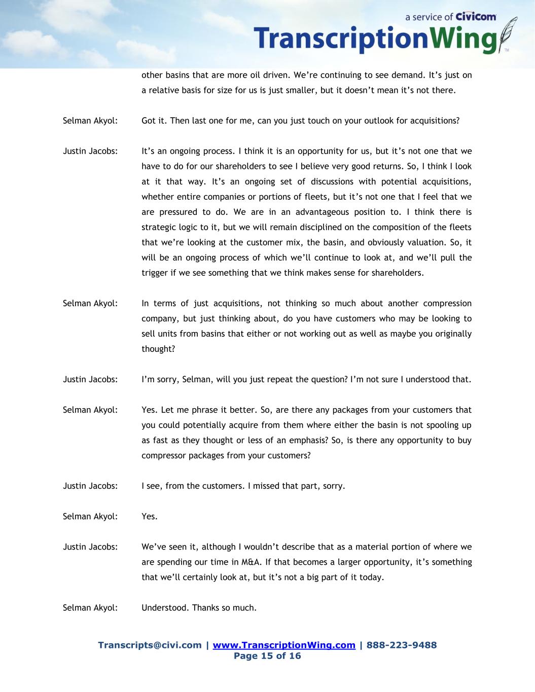 Transcripts@civi.com | www.TranscriptionWing.com | 888-223-9488 Page 15 of 16 other basins that are more oil driven. We’re continuing to see demand. It’s just on a relative basis for size for us is just smaller, but it doesn’t mean it’s not there. Selman Akyol: Got it. Then last one for me, can you just touch on your outlook for acquisitions? Justin Jacobs: It’s an ongoing process. I think it is an opportunity for us, but it’s not one that we have to do for our shareholders to see I believe very good returns. So, I think I look at it that way. It’s an ongoing set of discussions with potential acquisitions, whether entire companies or portions of fleets, but it’s not one that I feel that we are pressured to do. We are in an advantageous position to. I think there is strategic logic to it, but we will remain disciplined on the composition of the fleets that we’re looking at the customer mix, the basin, and obviously valuation. So, it will be an ongoing process of which we’ll continue to look at, and we’ll pull the trigger if we see something that we think makes sense for shareholders. Selman Akyol: In terms of just acquisitions, not thinking so much about another compression company, but just thinking about, do you have customers who may be looking to sell units from basins that either or not working out as well as maybe you originally thought? Justin Jacobs: I’m sorry, Selman, will you just repeat the question? I’m not sure I understood that. Selman Akyol: Yes. Let me phrase it better. So, are there any packages from your customers that you could potentially acquire from them where either the basin is not spooling up as fast as they thought or less of an emphasis? So, is there any opportunity to buy compressor packages from your customers? Justin Jacobs: I see, from the customers. I missed that part, sorry. Selman Akyol: Yes. Justin Jacobs: We’ve seen it, although I wouldn’t describe that as a material portion of where we are spending our time in M&A. If that becomes a larger opportunity, it’s something that we’ll certainly look at, but it’s not a big part of it today. Selman Akyol: Understood. Thanks so much.