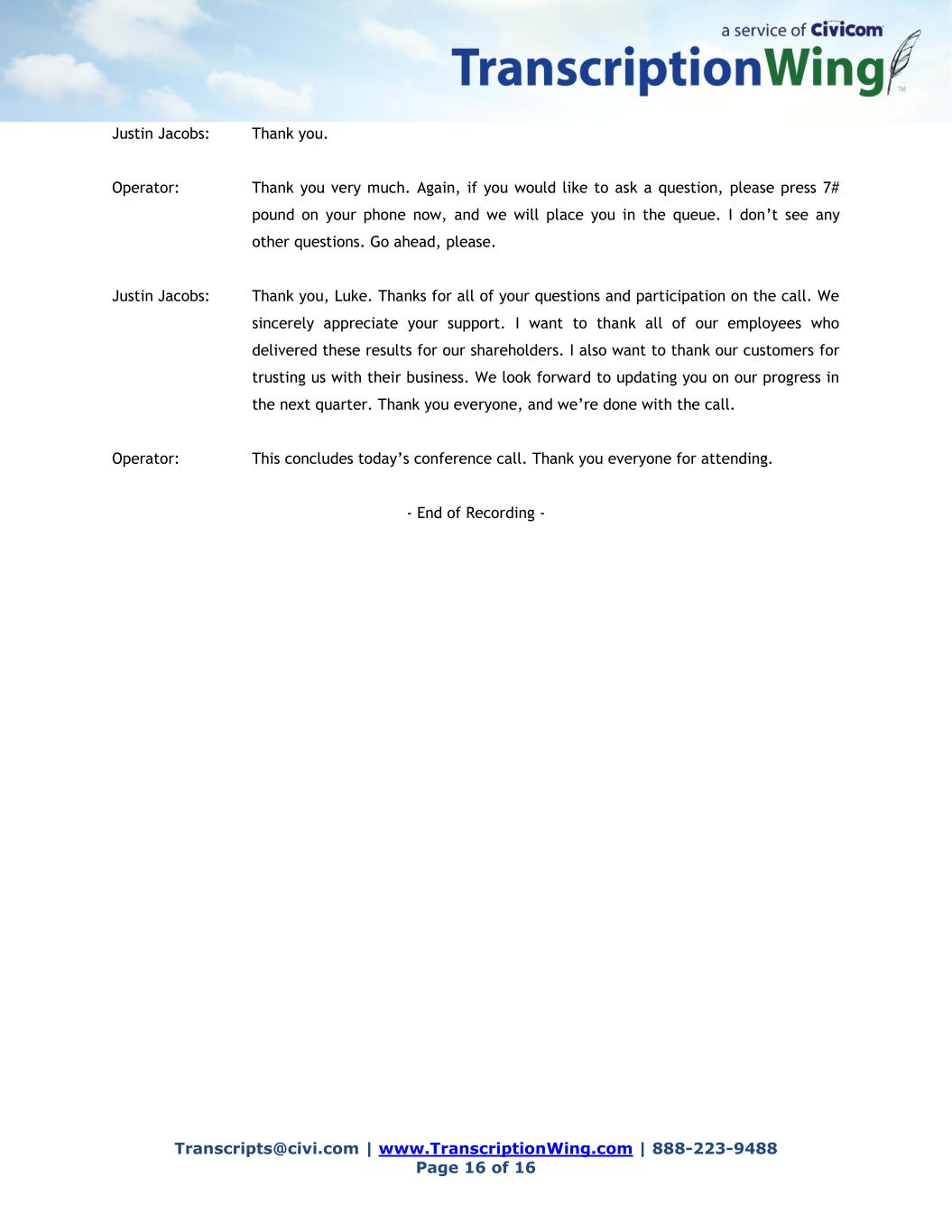 Transcripts@civi.com | www.TranscriptionWing.com | 888-223-9488 Page 16 of 16 Justin Jacobs: Thank you. Operator: Thank you very much. Again, if you would like to ask a question, please press 7# pound on your phone now, and we will place you in the queue. I don’t see any other questions. Go ahead, please. Justin Jacobs: Thank you, Luke. Thanks for all of your questions and participation on the call. We sincerely appreciate your support. I want to thank all of our employees who delivered these results for our shareholders. I also want to thank our customers for trusting us with their business. We look forward to updating you on our progress in the next quarter. Thank you everyone, and we’re done with the call. Operator: This concludes today’s conference call. Thank you everyone for attending. - End of Recording -