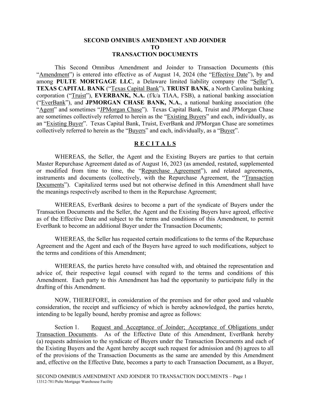 SECOND OMNIBUS AMENDMENT AND JOINDER TO TRANSACTION DOCUMENTS – Page 1 13312-781/Pulte Mortgage Warehouse Facility SECOND OMNIBUS AMENDMENT AND JOINDER TO TRANSACTION DOCUMENTS This Second Omnibus Amendment and Joinder to Transaction Documents (this “Amendment”) is entered into effective as of August 14, 2024 (the “Effective Date”), by and among PULTE MORTGAGE LLC, a Delaware limited liability company (the “Seller”), TEXAS CAPITAL BANK (“Texas Capital Bank”), TRUIST BANK, a North Carolina banking corporation (“Truist”), EVERBANK, N.A. (f/k/a TIAA, FSB), a national banking association (“EverBank”), and JPMORGAN CHASE BANK, N.A., a national banking association (the “Agent” and sometimes “JPMorgan Chase”). Texas Capital Bank, Truist and JPMorgan Chase are sometimes collectively referred to herein as the “Existing Buyers” and each, individually, as an “Existing Buyer”. Texas Capital Bank, Truist, EverBank and JPMorgan Chase are sometimes collectively referred to herein as the “Buyers” and each, individually, as a “Buyer”. R E C I T A L S WHEREAS, the Seller, the Agent and the Existing Buyers are parties to that certain Master Repurchase Agreement dated as of August 16, 2023 (as amended, restated, supplemented or modified from time to time, the “Repurchase Agreement”), and related agreements, instruments and documents (collectively, with the Repurchase Agreement, the “Transaction Documents”). Capitalized terms used but not otherwise defined in this Amendment shall have the meanings respectively ascribed to them in the Repurchase Agreement; WHEREAS, EverBank desires to become a part of the syndicate of Buyers under the Transaction Documents and the Seller, the Agent and the Existing Buyers have agreed, effective as of the Effective Date and subject to the terms and conditions of this Amendment, to permit EverBank to become an additional Buyer under the Transaction Documents; WHEREAS, the Seller has requested certain modifications to the terms of the Repurchase Agreement and the Agent and each of the Buyers have agreed to such modifications, subject to the terms and conditions of this Amendment; WHEREAS, the parties hereto have consulted with, and obtained the representation and advice of, their respective legal counsel with regard to the terms and conditions of this Amendment. Each party to this Amendment has had the opportunity to participate fully in the drafting of this Amendment. NOW, THEREFORE, in consideration of the premises and for other good and valuable consideration, the receipt and sufficiency of which is hereby acknowledged, the parties hereto, intending to be legally bound, hereby promise and agree as follows: Section 1. Request and Acceptance of Joinder; Acceptance of Obligations under Transaction Documents. As of the Effective Date of this Amendment, EverBank hereby (a) requests admission to the syndicate of Buyers under the Transaction Documents and each of the Existing Buyers and the Agent hereby accept such request for admission and (b) agrees to all of the provisions of the Transaction Documents as the same are amended by this Amendment and, effective on the Effective Date, becomes a party to each Transaction Document, as a Buyer,
