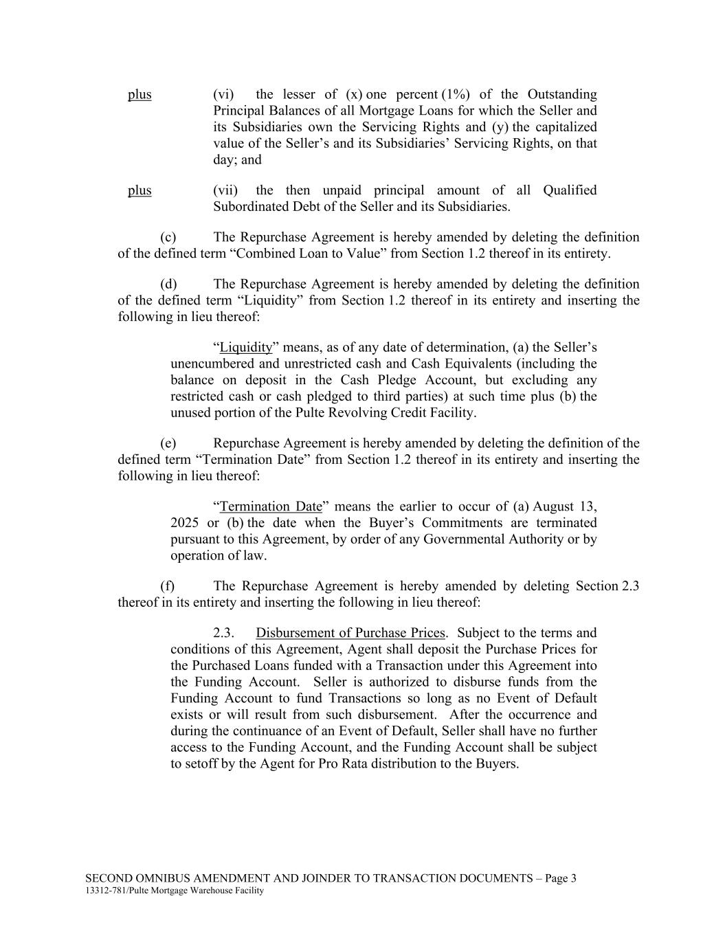 SECOND OMNIBUS AMENDMENT AND JOINDER TO TRANSACTION DOCUMENTS – Page 3 13312-781/Pulte Mortgage Warehouse Facility plus (vi) the lesser of (x) one percent (1%) of the Outstanding Principal Balances of all Mortgage Loans for which the Seller and its Subsidiaries own the Servicing Rights and (y) the capitalized value of the Seller’s and its Subsidiaries’ Servicing Rights, on that day; and plus (vii) the then unpaid principal amount of all Qualified Subordinated Debt of the Seller and its Subsidiaries. (c) The Repurchase Agreement is hereby amended by deleting the definition of the defined term “Combined Loan to Value” from Section 1.2 thereof in its entirety. (d) The Repurchase Agreement is hereby amended by deleting the definition of the defined term “Liquidity” from Section 1.2 thereof in its entirety and inserting the following in lieu thereof: “Liquidity” means, as of any date of determination, (a) the Seller’s unencumbered and unrestricted cash and Cash Equivalents (including the balance on deposit in the Cash Pledge Account, but excluding any restricted cash or cash pledged to third parties) at such time plus (b) the unused portion of the Pulte Revolving Credit Facility. (e) Repurchase Agreement is hereby amended by deleting the definition of the defined term “Termination Date” from Section 1.2 thereof in its entirety and inserting the following in lieu thereof: “Termination Date” means the earlier to occur of (a) August 13, 2025 or (b) the date when the Buyer’s Commitments are terminated pursuant to this Agreement, by order of any Governmental Authority or by operation of law. (f) The Repurchase Agreement is hereby amended by deleting Section 2.3 thereof in its entirety and inserting the following in lieu thereof: 2.3. Disbursement of Purchase Prices. Subject to the terms and conditions of this Agreement, Agent shall deposit the Purchase Prices for the Purchased Loans funded with a Transaction under this Agreement into the Funding Account. Seller is authorized to disburse funds from the Funding Account to fund Transactions so long as no Event of Default exists or will result from such disbursement. After the occurrence and during the continuance of an Event of Default, Seller shall have no further access to the Funding Account, and the Funding Account shall be subject to setoff by the Agent for Pro Rata distribution to the Buyers.