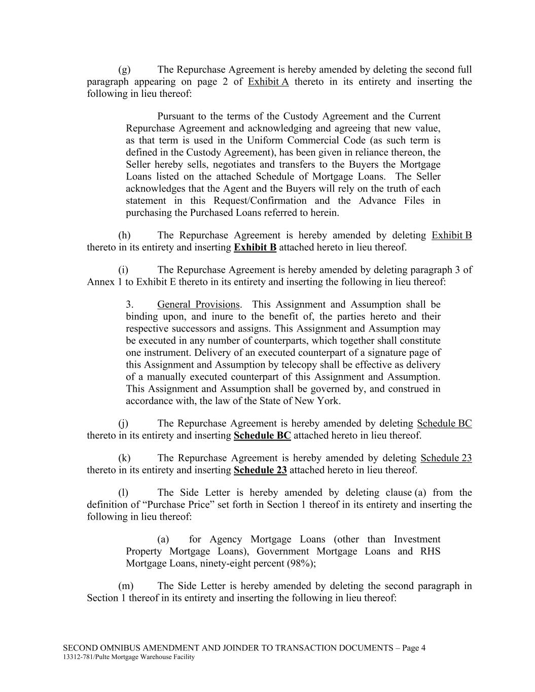 SECOND OMNIBUS AMENDMENT AND JOINDER TO TRANSACTION DOCUMENTS – Page 4 13312-781/Pulte Mortgage Warehouse Facility (g) The Repurchase Agreement is hereby amended by deleting the second full paragraph appearing on page 2 of Exhibit A thereto in its entirety and inserting the following in lieu thereof: Pursuant to the terms of the Custody Agreement and the Current Repurchase Agreement and acknowledging and agreeing that new value, as that term is used in the Uniform Commercial Code (as such term is defined in the Custody Agreement), has been given in reliance thereon, the Seller hereby sells, negotiates and transfers to the Buyers the Mortgage Loans listed on the attached Schedule of Mortgage Loans. The Seller acknowledges that the Agent and the Buyers will rely on the truth of each statement in this Request/Confirmation and the Advance Files in purchasing the Purchased Loans referred to herein. (h) The Repurchase Agreement is hereby amended by deleting Exhibit B thereto in its entirety and inserting Exhibit B attached hereto in lieu thereof. (i) The Repurchase Agreement is hereby amended by deleting paragraph 3 of Annex 1 to Exhibit E thereto in its entirety and inserting the following in lieu thereof: 3. General Provisions. This Assignment and Assumption shall be binding upon, and inure to the benefit of, the parties hereto and their respective successors and assigns. This Assignment and Assumption may be executed in any number of counterparts, which together shall constitute one instrument. Delivery of an executed counterpart of a signature page of this Assignment and Assumption by telecopy shall be effective as delivery of a manually executed counterpart of this Assignment and Assumption. This Assignment and Assumption shall be governed by, and construed in accordance with, the law of the State of New York. (j) The Repurchase Agreement is hereby amended by deleting Schedule BC thereto in its entirety and inserting Schedule BC attached hereto in lieu thereof. (k) The Repurchase Agreement is hereby amended by deleting Schedule 23 thereto in its entirety and inserting Schedule 23 attached hereto in lieu thereof. (l) The Side Letter is hereby amended by deleting clause (a) from the definition of “Purchase Price” set forth in Section 1 thereof in its entirety and inserting the following in lieu thereof: (a) for Agency Mortgage Loans (other than Investment Property Mortgage Loans), Government Mortgage Loans and RHS Mortgage Loans, ninety-eight percent (98%); (m) The Side Letter is hereby amended by deleting the second paragraph in Section 1 thereof in its entirety and inserting the following in lieu thereof: