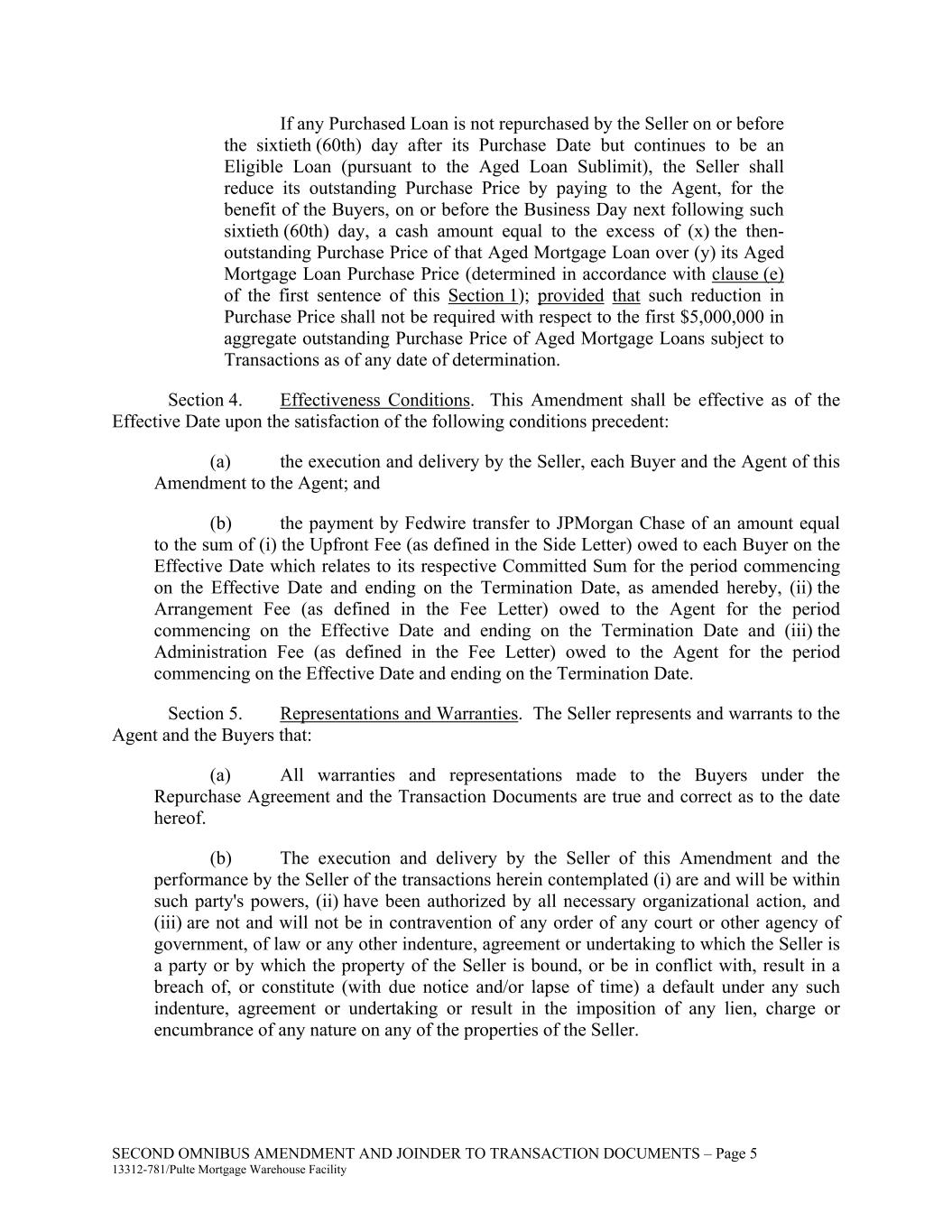 SECOND OMNIBUS AMENDMENT AND JOINDER TO TRANSACTION DOCUMENTS – Page 5 13312-781/Pulte Mortgage Warehouse Facility If any Purchased Loan is not repurchased by the Seller on or before the sixtieth (60th) day after its Purchase Date but continues to be an Eligible Loan (pursuant to the Aged Loan Sublimit), the Seller shall reduce its outstanding Purchase Price by paying to the Agent, for the benefit of the Buyers, on or before the Business Day next following such sixtieth (60th) day, a cash amount equal to the excess of (x) the then- outstanding Purchase Price of that Aged Mortgage Loan over (y) its Aged Mortgage Loan Purchase Price (determined in accordance with clause (e) of the first sentence of this Section 1); provided that such reduction in Purchase Price shall not be required with respect to the first $5,000,000 in aggregate outstanding Purchase Price of Aged Mortgage Loans subject to Transactions as of any date of determination. Section 4. Effectiveness Conditions. This Amendment shall be effective as of the Effective Date upon the satisfaction of the following conditions precedent: (a) the execution and delivery by the Seller, each Buyer and the Agent of this Amendment to the Agent; and (b) the payment by Fedwire transfer to JPMorgan Chase of an amount equal to the sum of (i) the Upfront Fee (as defined in the Side Letter) owed to each Buyer on the Effective Date which relates to its respective Committed Sum for the period commencing on the Effective Date and ending on the Termination Date, as amended hereby, (ii) the Arrangement Fee (as defined in the Fee Letter) owed to the Agent for the period commencing on the Effective Date and ending on the Termination Date and (iii) the Administration Fee (as defined in the Fee Letter) owed to the Agent for the period commencing on the Effective Date and ending on the Termination Date. Section 5. Representations and Warranties. The Seller represents and warrants to the Agent and the Buyers that: (a) All warranties and representations made to the Buyers under the Repurchase Agreement and the Transaction Documents are true and correct as to the date hereof. (b) The execution and delivery by the Seller of this Amendment and the performance by the Seller of the transactions herein contemplated (i) are and will be within such party's powers, (ii) have been authorized by all necessary organizational action, and (iii) are not and will not be in contravention of any order of any court or other agency of government, of law or any other indenture, agreement or undertaking to which the Seller is a party or by which the property of the Seller is bound, or be in conflict with, result in a breach of, or constitute (with due notice and/or lapse of time) a default under any such indenture, agreement or undertaking or result in the imposition of any lien, charge or encumbrance of any nature on any of the properties of the Seller.