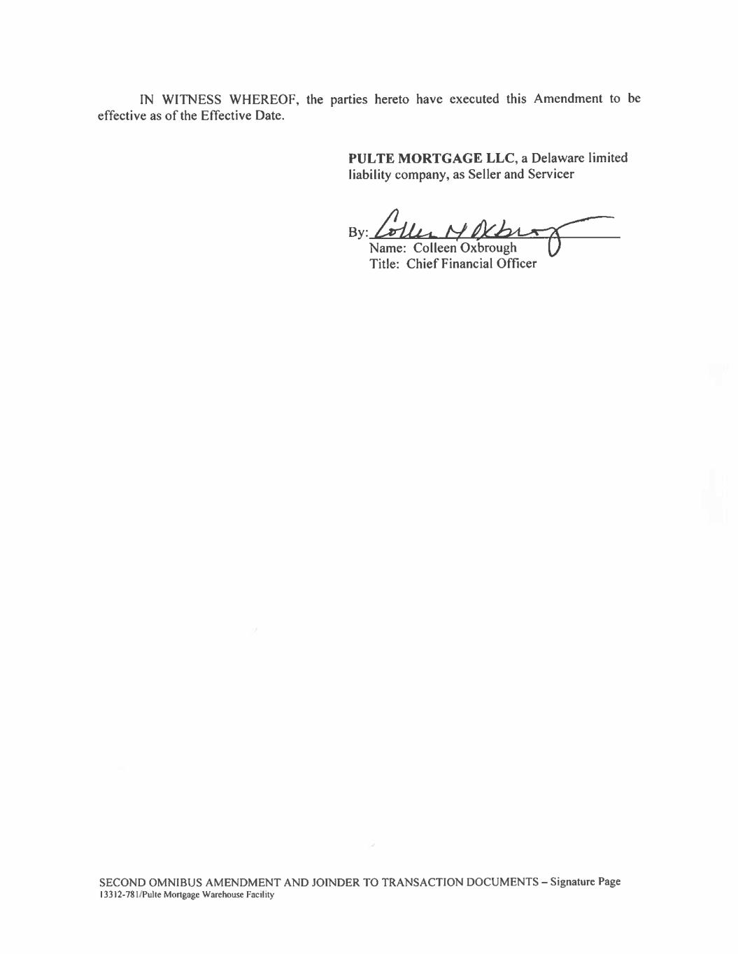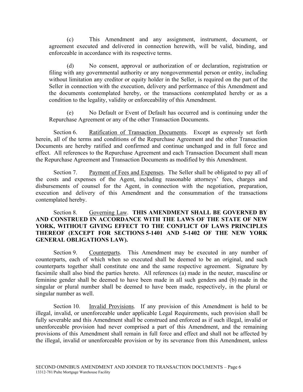 SECOND OMNIBUS AMENDMENT AND JOINDER TO TRANSACTION DOCUMENTS – Page 6 13312-781/Pulte Mortgage Warehouse Facility (c) This Amendment and any assignment, instrument, document, or agreement executed and delivered in connection herewith, will be valid, binding, and enforceable in accordance with its respective terms. (d) No consent, approval or authorization of or declaration, registration or filing with any governmental authority or any nongovernmental person or entity, including without limitation any creditor or equity holder in the Seller, is required on the part of the Seller in connection with the execution, delivery and performance of this Amendment and the documents contemplated hereby, or the transactions contemplated hereby or as a condition to the legality, validity or enforceability of this Amendment. (e) No Default or Event of Default has occurred and is continuing under the Repurchase Agreement or any of the other Transaction Documents. Section 6. Ratification of Transaction Documents. Except as expressly set forth herein, all of the terms and conditions of the Repurchase Agreement and the other Transaction Documents are hereby ratified and confirmed and continue unchanged and in full force and effect. All references to the Repurchase Agreement and each Transaction Document shall mean the Repurchase Agreement and Transaction Documents as modified by this Amendment. Section 7. Payment of Fees and Expenses. The Seller shall be obligated to pay all of the costs and expenses of the Agent, including reasonable attorneys’ fees, charges and disbursements of counsel for the Agent, in connection with the negotiation, preparation, execution and delivery of this Amendment and the consummation of the transactions contemplated hereby. Section 8. Governing Law. THIS AMENDMENT SHALL BE GOVERNED BY AND CONSTRUED IN ACCORDANCE WITH THE LAWS OF THE STATE OF NEW YORK, WITHOUT GIVING EFFECT TO THE CONFLICT OF LAWS PRINCIPLES THEREOF (EXCEPT FOR SECTIONS 5-1401 AND 5-1402 OF THE NEW YORK GENERAL OBLIGATIONS LAW). Section 9. Counterparts. This Amendment may be executed in any number of counterparts, each of which when so executed shall be deemed to be an original, and such counterparts together shall constitute one and the same respective agreement. Signature by facsimile shall also bind the parties hereto. All references (a) made in the neuter, masculine or feminine gender shall be deemed to have been made in all such genders and (b) made in the singular or plural number shall be deemed to have been made, respectively, in the plural or singular number as well. Section 10. Invalid Provisions. If any provision of this Amendment is held to be illegal, invalid, or unenforceable under applicable Legal Requirements, such provision shall be fully severable and this Amendment shall be construed and enforced as if such illegal, invalid or unenforceable provision had never comprised a part of this Amendment, and the remaining provisions of this Amendment shall remain in full force and effect and shall not be affected by the illegal, invalid or unenforceable provision or by its severance from this Amendment, unless