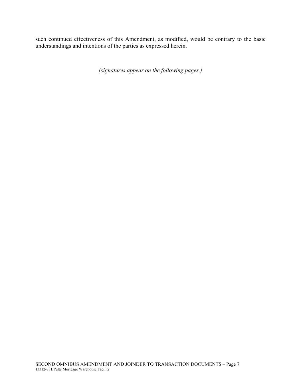SECOND OMNIBUS AMENDMENT AND JOINDER TO TRANSACTION DOCUMENTS – Page 7 13312-781/Pulte Mortgage Warehouse Facility such continued effectiveness of this Amendment, as modified, would be contrary to the basic understandings and intentions of the parties as expressed herein. [signatures appear on the following pages.]