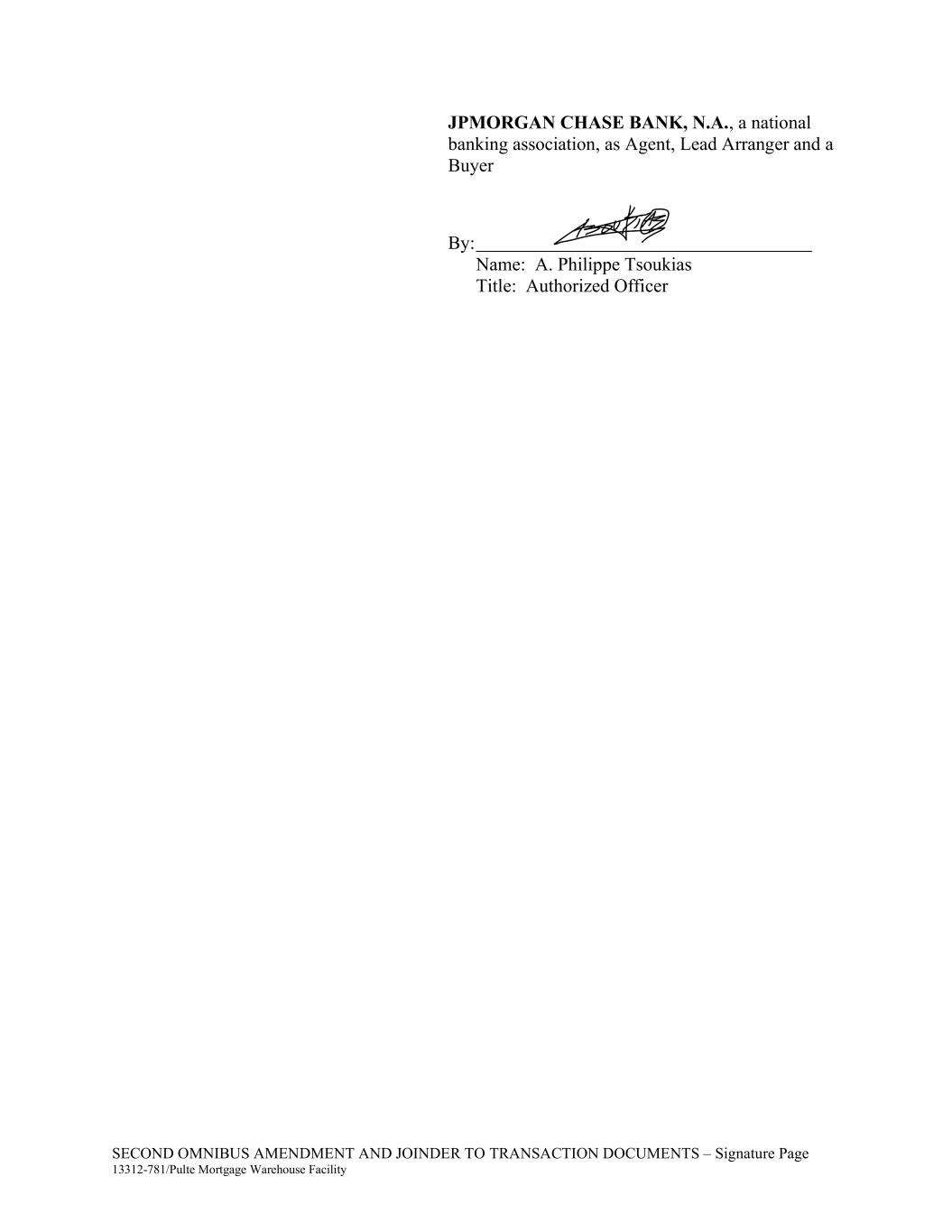 SECOND OMNIBUS AMENDMENT AND JOINDER TO TRANSACTION DOCUMENTS – Signature Page 13312-781/Pulte Mortgage Warehouse Facility JPMORGAN CHASE BANK, N.A., a national banking association, as Agent, Lead Arranger and a Buyer By: Name: A. Philippe Tsoukias Title: Authorized Officer