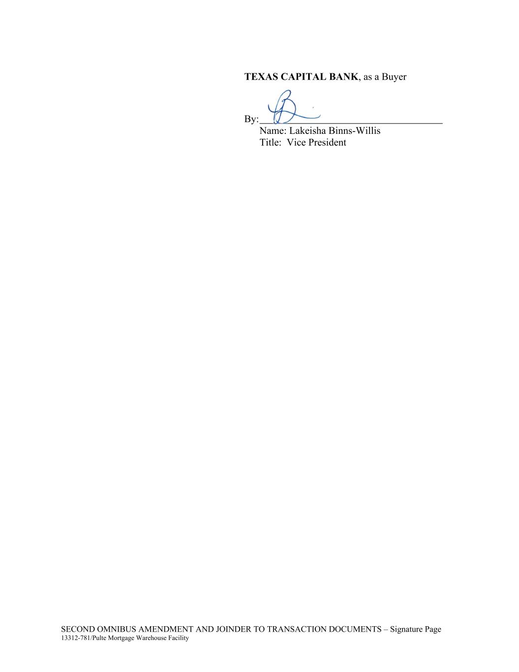 SECOND OMNIBUS AMENDMENT AND JOINDER TO TRANSACTION DOCUMENTS – Signature Page 13312-781/Pulte Mortgage Warehouse Facility TEXAS CAPITAL BANK, as a Buyer By: Name: Lakeisha Binns-Willis Title: Vice President