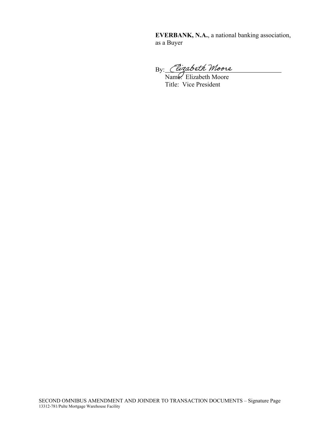SECOND OMNIBUS AMENDMENT AND JOINDER TO TRANSACTION DOCUMENTS – Signature Page 13312-781/Pulte Mortgage Warehouse Facility EVERBANK, N.A., a national banking association, as a Buyer By: Name: Elizabeth Moore Title: Vice President