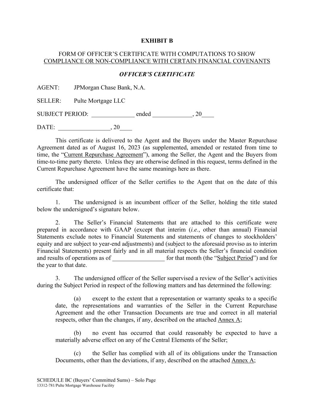 SCHEDULE BC (Buyers’ Committed Sums) – Solo Page 13312-781/Pulte Mortgage Warehouse Facility EXHIBIT B FORM OF OFFICER’S CERTIFICATE WITH COMPUTATIONS TO SHOW COMPLIANCE OR NON-COMPLIANCE WITH CERTAIN FINANCIAL COVENANTS OFFICER’S CERTIFICATE AGENT: JPMorgan Chase Bank, N.A. SELLER: Pulte Mortgage LLC SUBJECT PERIOD: ______________ ended _____________, 20____ DATE: _________________, 20____ This certificate is delivered to the Agent and the Buyers under the Master Repurchase Agreement dated as of August 16, 2023 (as supplemented, amended or restated from time to time, the “Current Repurchase Agreement”), among the Seller, the Agent and the Buyers from time-to-time party thereto. Unless they are otherwise defined in this request, terms defined in the Current Repurchase Agreement have the same meanings here as there. The undersigned officer of the Seller certifies to the Agent that on the date of this certificate that: 1. The undersigned is an incumbent officer of the Seller, holding the title stated below the undersigned’s signature below. 2. The Seller’s Financial Statements that are attached to this certificate were prepared in accordance with GAAP (except that interim (i.e., other than annual) Financial Statements exclude notes to Financial Statements and statements of changes to stockholders’ equity and are subject to year-end adjustments) and (subject to the aforesaid proviso as to interim Financial Statements) present fairly and in all material respects the Seller’s financial condition and results of operations as of _________________ for that month (the “Subject Period”) and for the year to that date. 3. The undersigned officer of the Seller supervised a review of the Seller’s activities during the Subject Period in respect of the following matters and has determined the following: (a) except to the extent that a representation or warranty speaks to a specific date, the representations and warranties of the Seller in the Current Repurchase Agreement and the other Transaction Documents are true and correct in all material respects, other than the changes, if any, described on the attached Annex A; (b) no event has occurred that could reasonably be expected to have a materially adverse effect on any of the Central Elements of the Seller; (c) the Seller has complied with all of its obligations under the Transaction Documents, other than the deviations, if any, described on the attached Annex A;