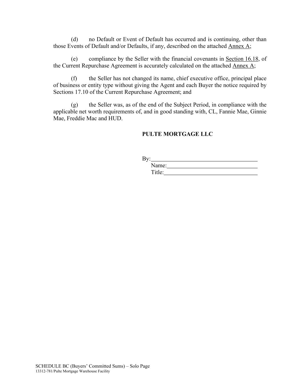 SCHEDULE BC (Buyers’ Committed Sums) – Solo Page 13312-781/Pulte Mortgage Warehouse Facility (d) no Default or Event of Default has occurred and is continuing, other than those Events of Default and/or Defaults, if any, described on the attached Annex A; (e) compliance by the Seller with the financial covenants in Section 16.18, of the Current Repurchase Agreement is accurately calculated on the attached Annex A; (f) the Seller has not changed its name, chief executive office, principal place of business or entity type without giving the Agent and each Buyer the notice required by Sections 17.10 of the Current Repurchase Agreement; and (g) the Seller was, as of the end of the Subject Period, in compliance with the applicable net worth requirements of, and in good standing with, CL, Fannie Mae, Ginnie Mae, Freddie Mac and HUD. PULTE MORTGAGE LLC By: Name: Title: