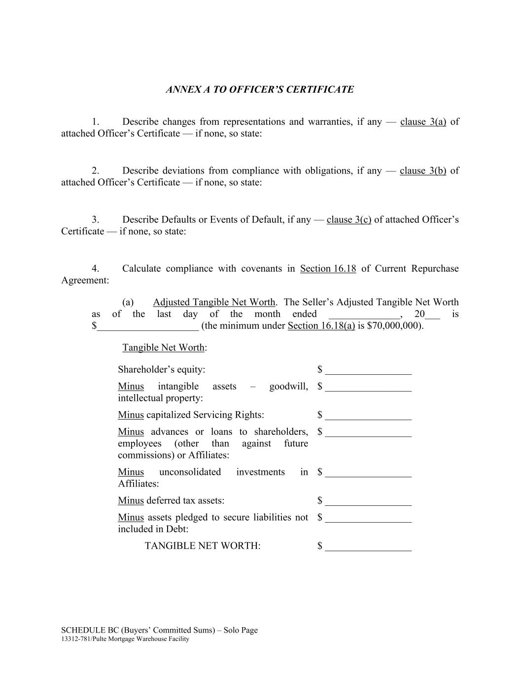 SCHEDULE BC (Buyers’ Committed Sums) – Solo Page 13312-781/Pulte Mortgage Warehouse Facility ANNEX A TO OFFICER’S CERTIFICATE 1. Describe changes from representations and warranties, if any — clause 3(a) of attached Officer’s Certificate — if none, so state: 2. Describe deviations from compliance with obligations, if any — clause 3(b) of attached Officer’s Certificate — if none, so state: 3. Describe Defaults or Events of Default, if any — clause 3(c) of attached Officer’s Certificate — if none, so state: 4. Calculate compliance with covenants in Section 16.18 of Current Repurchase Agreement: (a) Adjusted Tangible Net Worth. The Seller’s Adjusted Tangible Net Worth as of the last day of the month ended ______________, 20___ is $____________________ (the minimum under Section 16.18(a) is $70,000,000). Tangible Net Worth: Shareholder’s equity: $ _________________ Minus intangible assets – goodwill, intellectual property: $ _________________ Minus capitalized Servicing Rights: $ _________________ Minus advances or loans to shareholders, employees (other than against future commissions) or Affiliates: $ _________________ Minus unconsolidated investments in Affiliates: $ _________________ Minus deferred tax assets: $ _________________ Minus assets pledged to secure liabilities not included in Debt: $ _________________ TANGIBLE NET WORTH: $ _________________