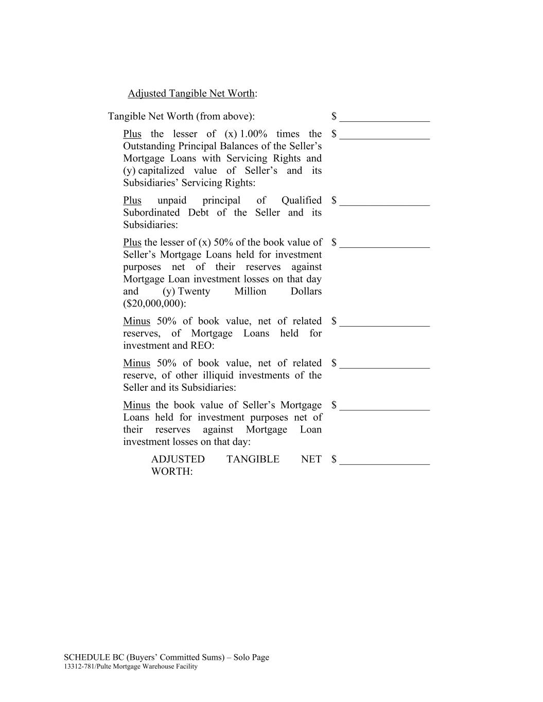 SCHEDULE BC (Buyers’ Committed Sums) – Solo Page 13312-781/Pulte Mortgage Warehouse Facility Adjusted Tangible Net Worth: Tangible Net Worth (from above): $ _________________ Plus the lesser of (x) 1.00% times the Outstanding Principal Balances of the Seller’s Mortgage Loans with Servicing Rights and (y) capitalized value of Seller’s and its Subsidiaries’ Servicing Rights: $ _________________ Plus unpaid principal of Qualified Subordinated Debt of the Seller and its Subsidiaries: $ _________________ Plus the lesser of (x) 50% of the book value of Seller’s Mortgage Loans held for investment purposes net of their reserves against Mortgage Loan investment losses on that day and (y) Twenty Million Dollars ($20,000,000): $ _________________ Minus 50% of book value, net of related reserves, of Mortgage Loans held for investment and REO: $ _________________ Minus 50% of book value, net of related reserve, of other illiquid investments of the Seller and its Subsidiaries: $ _________________ Minus the book value of Seller’s Mortgage Loans held for investment purposes net of their reserves against Mortgage Loan investment losses on that day: $ _________________ ADJUSTED TANGIBLE NET WORTH: $ _________________