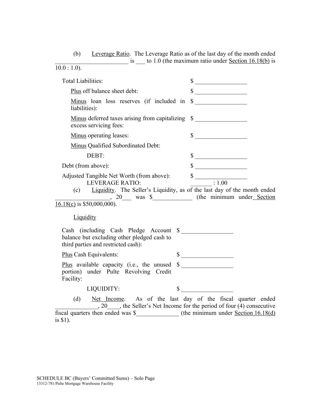 SCHEDULE BC (Buyers’ Committed Sums) – Solo Page 13312-781/Pulte Mortgage Warehouse Facility (b) Leverage Ratio. The Leverage Ratio as of the last day of the month ended ________________________ is ___ to 1.0 (the maximum ratio under Section 16.18(b) is 10.0 : 1.0). Total Liabilities: $ _________________ Plus off balance sheet debt: $ _________________ Minus loan loss reserves (if included in liabilities): $ _________________ Minus deferred taxes arising from capitalizing excess servicing fees: $ _________________ Minus operating leases: $ _________________ Minus Qualified Subordinated Debt: DEBT: $ _________________ Debt (from above): $ _________________ Adjusted Tangible Net Worth (from above): $ _________________ LEVERAGE RATIO: _______ : 1.00 (c) Liquidity. The Seller’s Liquidity, as of the last day of the month ended __________________, 20___ was $_____________ (the minimum under Section 16.18(c) is $50,000,000). Liquidity Cash (including Cash Pledge Account balance but excluding other pledged cash to third parties and restricted cash): $ _________________ Plus Cash Equivalents: $ _________________ Plus available capacity (i.e., the unused portion) under Pulte Revolving Credit Facility: $ _________________ LIQUIDITY: $ _________________ (d) Net Income. As of the last day of the fiscal quarter ended ______________, 20____, the Seller’s Net Income for the period of four (4) consecutive fiscal quarters then ended was $______________ (the minimum under Section 16.18(d) is $1).