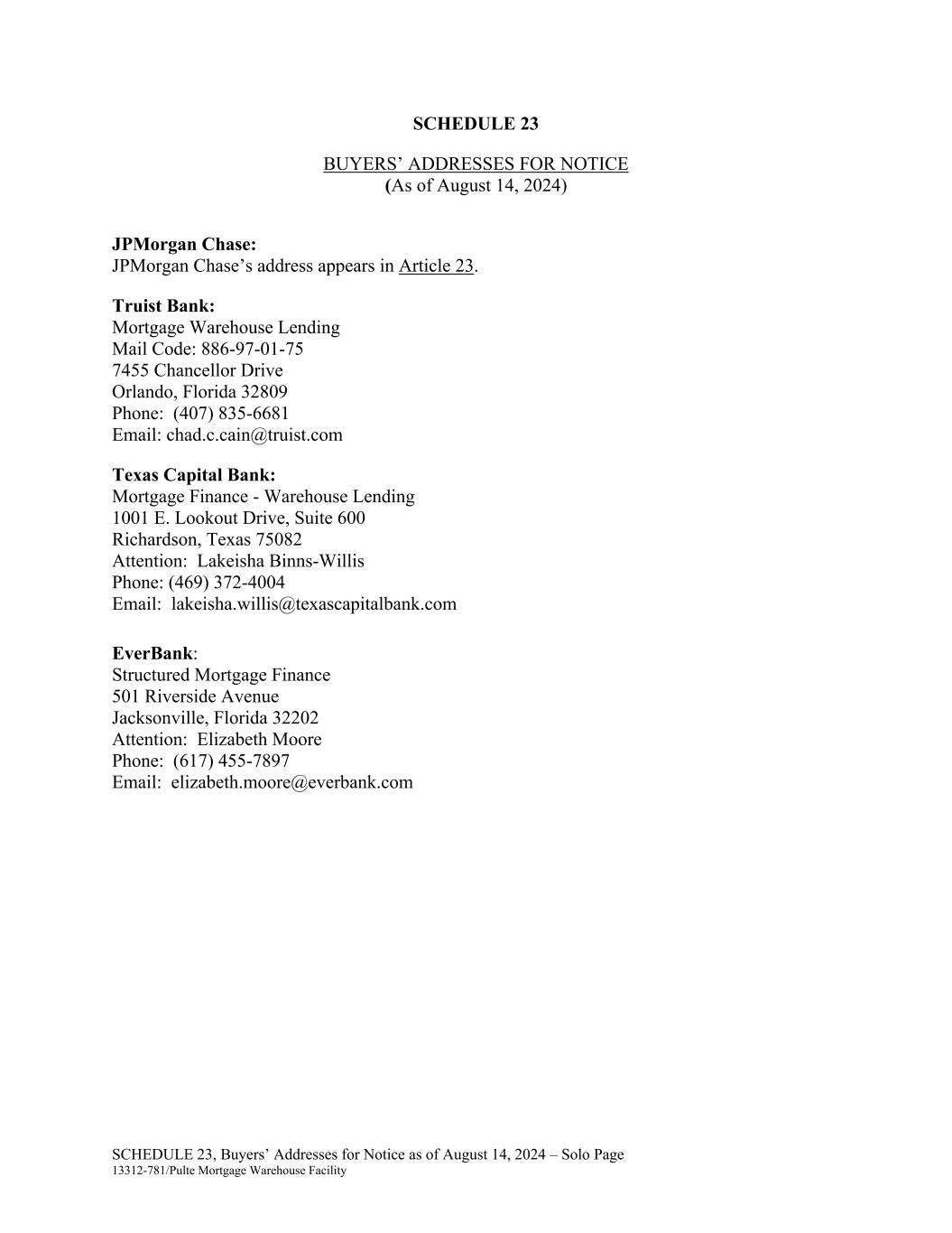 SCHEDULE 23, Buyers’ Addresses for Notice as of August 14, 2024 – Solo Page 13312-781/Pulte Mortgage Warehouse Facility SCHEDULE 23 BUYERS’ ADDRESSES FOR NOTICE (As of August 14, 2024) JPMorgan Chase: JPMorgan Chase’s address appears in Article 23. Truist Bank: Mortgage Warehouse Lending Mail Code: 886-97-01-75 7455 Chancellor Drive Orlando, Florida 32809 Phone: (407) 835-6681 Email: chad.c.cain@truist.com Texas Capital Bank: Mortgage Finance - Warehouse Lending 1001 E. Lookout Drive, Suite 600 Richardson, Texas 75082 Attention: Lakeisha Binns-Willis Phone: (469) 372-4004 Email: lakeisha.willis@texascapitalbank.com EverBank: Structured Mortgage Finance 501 Riverside Avenue Jacksonville, Florida 32202 Attention: Elizabeth Moore Phone: (617) 455-7897 Email: elizabeth.moore@everbank.com
