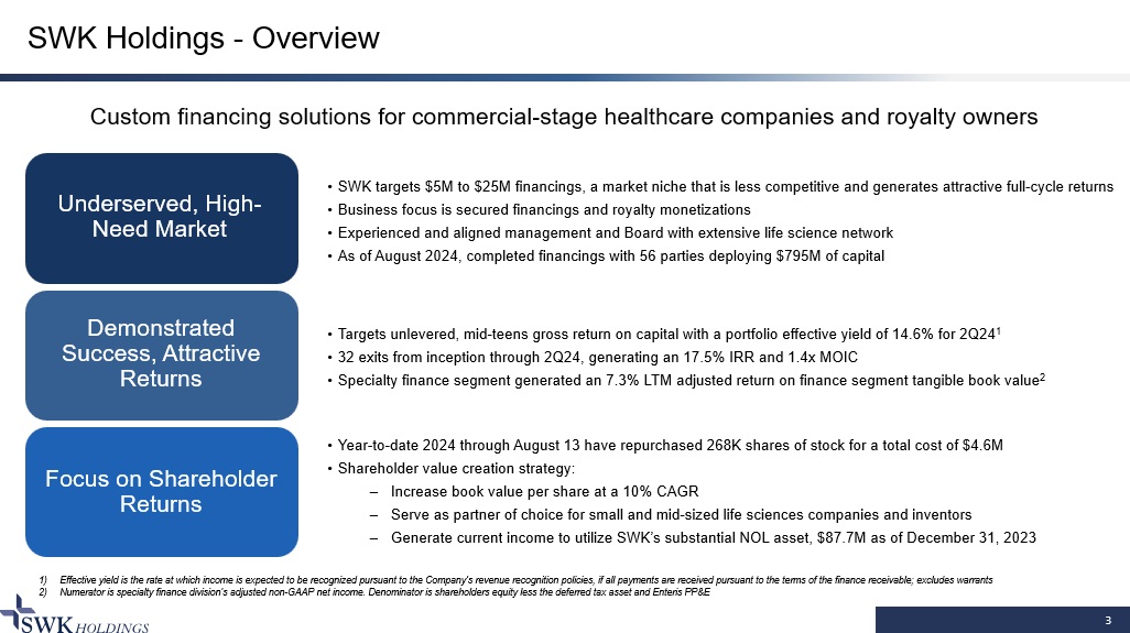 2 Forward - looking and Cautionary Statements Statements in this presentation that are not strictly historical, and any statements regarding events or developments that we be lieve or anticipate will or may occur in the future are "forward - looking" statements within the meaning of the federal securities laws. There are a number of important factors that could cause actual results, developments and business decisions to differ materially from those suggested or indicated by such forward - looking statements and you should not place undue reliance on any s uch forward - looking statements. Additional information regarding the factors that may cause actual results to differ materially from these forward - looking statements is available in o ur SEC filings, including our Annual Report on Form 10 - K for the most recent fiscal year and our Quarterly Reports on Form 10 - Q for subsequent periods. The Company does not assume any obligatio n to update or revise any forward - looking statement, whether as a result of new information, future events and developments or otherwise. Our specialty finance and asset management businesses are conducted through separate subsidiaries and the Company conducts it s o perations in a manner that is excluded from the definition of an investment company and exempt from registration and regulation under the Investment Company Act of 1940. This presentation is neither an offer to sell nor a solicitation of any offer to buy any securities, investment product or in ves tment advisory services, including such services offered by SWK Advisors LLC. This presentation does not contain all of the information necessary to make an investment decision, including, bu t not limited to, the risks, fees and investment strategies of investing in life science investments. Any offering is made only pursuant to the relevant information memorandum, a relevant su bscription agreement or investment management agreement, and SWK Advisors LLC’s Form ADV, all of which must be read in their entirety. All investors must be “accredited investors” and/or “q ualified purchasers” as defined in the securities laws before they can invest with SWK Advisors LLC. Life science securities may rely on milestone payments and/or a royalty stream from an underlying drug, device, or product wh ich may or may not have received approval of the Food and Drug Administration (“FDA”). If the underlying drug, device, or product does not receive FDA approval, it could negatively impact the securities, including the payments of principal and/or interest. In addition, the introduction of new drugs, devices, or products onto the market could negatively impact the securities, since t hat may decrease sales and/or prices of the underlying drug, device, or product. Changes to Medicare reimbursement or third - party payor pricing could negatively impact the securities, since they could negatively impact the prices and/or sales of the underlying drug, device, or product. There is also risk that the licensing agreement that governs the payment of royalties may terminate, whic h c ould negatively impact the securities. There is also the risk that litigation involving the underlying drug, device, or product could negatively impact the securities, including payments of pr inc ipal and/or interest on any securities.