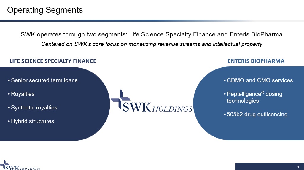 SWK Holdings - Overview 3 Underserved, High - Need Market Demonstrated Success, Attractive Returns Focus on Shareholder Returns Custom financing solutions for commercial - stage healthcare companies and royalty owners • SWK targets $5M to $25M financings, a market niche that is less competitive and generates attractive full - cycle returns • Business focus is secured financings and royalty monetizations • Experienced and aligned management and Board with extensive life science network • As of August 2024, completed financings with 56 parties deploying $795M of capital • Targets unlevered, mid - teens gross return on capital with a portfolio effective yield of 14.6% for 2Q24 1 • 32 exits from inception through 2Q24, generating an 17.5% IRR and 1.4x MOIC • Specialty finance segment generated an 7.3% LTM adjusted return on finance segment tangible book value 2 • Year - to - date 2024 through August 13 have repurchased 268K shares of stock for a total cost of $4.6M • Shareholder value creation strategy: – Increase book value per share at a 10% CAGR – Serve as partner of choice for small and mid - sized life sciences companies and inventors – Generate current income to utilize SWK’s substantial NOL asset, $87.7M as of December 31, 2023 1) Effective yield is the rate at which income is expected to be recognized pursuant to the Company’s revenue recognition polici es, if all payments are received pursuant to the terms of the finance receivable; excludes warrants 2) Numerator is specialty finance division’s adjusted non - GAAP net income. Denominator is shareholders equity less the deferred tax asset and Enteris PP&E JT0 JT1 JT2