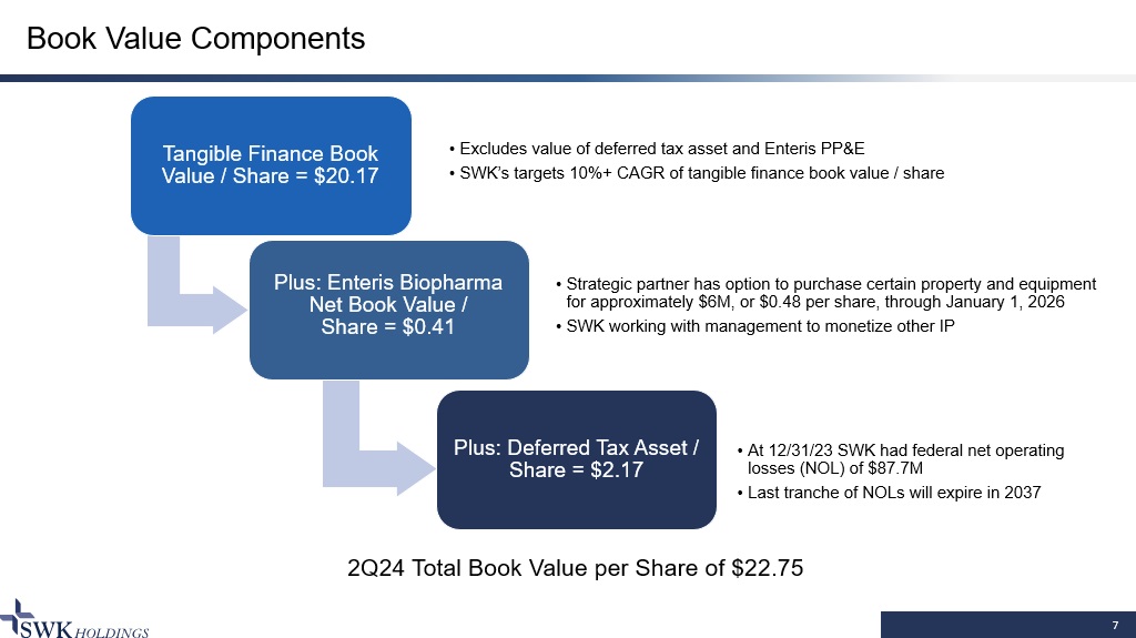 6 Value Creation Strategy SWK believes this strategy will continue to achieve a 10%+ book value per share CAGR Deploy balance sheet capital into secured financing portfolio • SWK has established reputation as a go - to capital provider in our market segment • Majority of financings structured with warrants or other equity - like upside features to enhance return profile Optimize Value at Enteris • Enteris working with strategic partner to grow CDMO business • Exclusive Option and Asset Purchase Agreement positions CDMO operations to be approximately break - even or better in exchange for partner having an exclusive two - year option to purchase certain tangible assets for approximately $6M • SWK working to monetize other Enteris IP Optimize capital structure to boost ROE • SWK targets a 10%+ ROE • SWK carries minimal leverage while similarly sized BDCs often carry 50% to 75% debt/equity leverage • Opportunistic share repurchases • Off - balance sheet capital would add to ROE