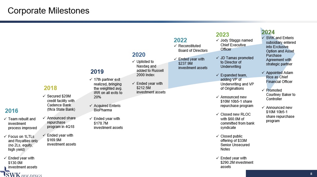 7 Book Value Components Tangible Finance Book Value / Share = $20.17 • Excludes value of deferred tax asset and Enteris PP&E • SWK’s targets 10%+ CAGR of tangible finance book value / share Plus: Enteris Biopharma Net Book Value / Share = $0.41 • Strategic partner has option to purchase certain property and equipment for approximately $6M, or $0.48 per share, through January 1, 2026 • SWK working with management to monetize other IP Plus: Deferred Tax Asset / Share = $2.17 • At 12/31/23 SWK had federal net operating losses (NOL) of $87.7M • Last tranche of NOLs will expire in 2037 2Q24 Total Book Value per Share of $22.75
