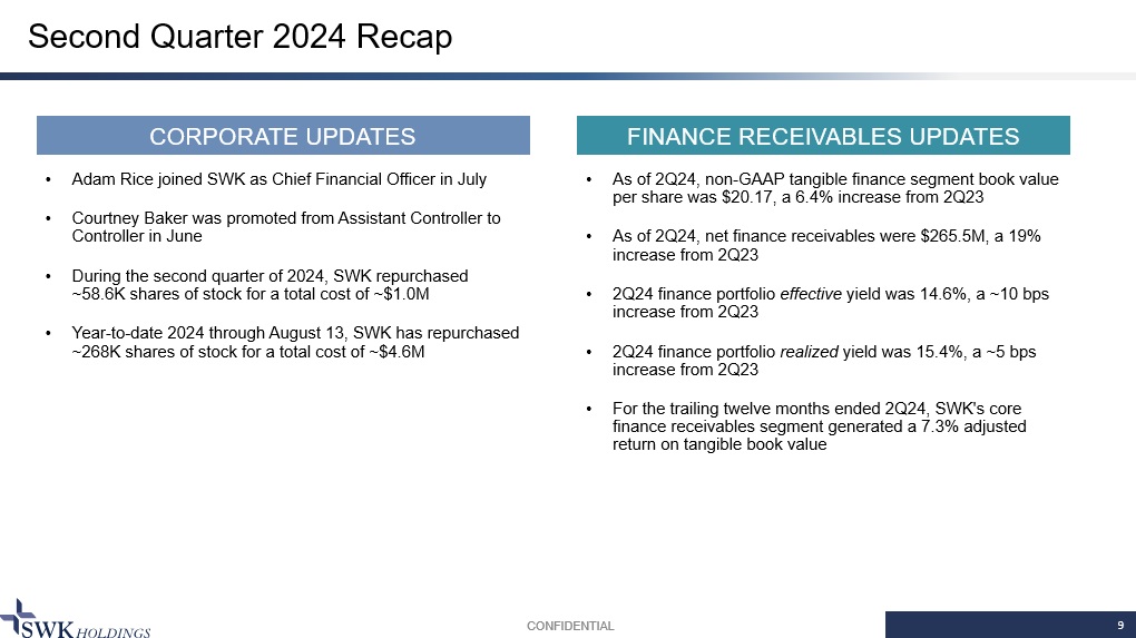Second Quarter 2024 Recap 9 CONFIDENTIAL CORPORATE UPDATES FINANCE RECEIVABLES UPDATES • Adam Rice joined SWK as Chief Financial Officer in July • Courtney Baker was promoted from Assistant Controller to Controller in June • During the second quarter of 2024, SWK repurchased ~58.6K shares of stock for a total cost of ~$1.0M • Year - to - date 2024 through August 13, SWK has repurchased ~268K shares of stock for a total cost of ~$4.6M • As of 2Q24, non - GAAP tangible finance segment book value per share was $20.17, a 6.4% increase from 2Q23 • As of 2Q24, net finance receivables were $265.5M, a 19% increase from 2Q23 • 2Q24 finance portfolio effective yield was 14.6%, a ~10 bps increase from 2Q23 • 2Q24 finance portfolio realized yield was 15.4%, a ~5 bps increase from 2Q23 • For the trailing twelve months ended 2Q24, SWK's core finance receivables segment generated a 7.3% adjusted return on tangible book value