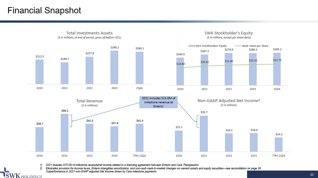 $21.1 $35.7 $18.1 $18.4 $14.2 2020 2021 2022 2023 TTM 2Q24 Non - GAAP Adjusted Net Income 2 ($ in millions) $240.5 $267.2 $279.9 $280.3 $283.2 $18.80 $20.82 $21.80 $22.43 $22.75 2020 2021 2022 2023 2Q24 SWK Stockholder's Equity ($ in millions; except per share data) SWK Stockholders' Equity Book Value per Share $212.5 $189.7 $237.9 $290.2 $280.1 2020 2021 2022 2023 2Q24 Total Investments Assets ($ in millions; at end of period; gross of/before CECL) $36.7 $56.2 $41.5 $37.8 $41.4 2020 2021 2022 2023 TTM 2Q24 Total Revenue ($ in millions) 11 Financial Snapshot 1) 2021 includes $15.0M of milestone revenue/net income related to a licensing agreement between Enteris and Cara Therapeutics 2) Eliminates provision for income taxes, Enteris intangibles amortization, and non - cash mark - to - market changes on warrant assets a nd equity securities — see reconciliation on page 26. Outperformance in 2021 non - GAAP adjusted Net Income driven by Cara milestone payments 2021 includes $15.0M of milestone revenue at Enteris 1