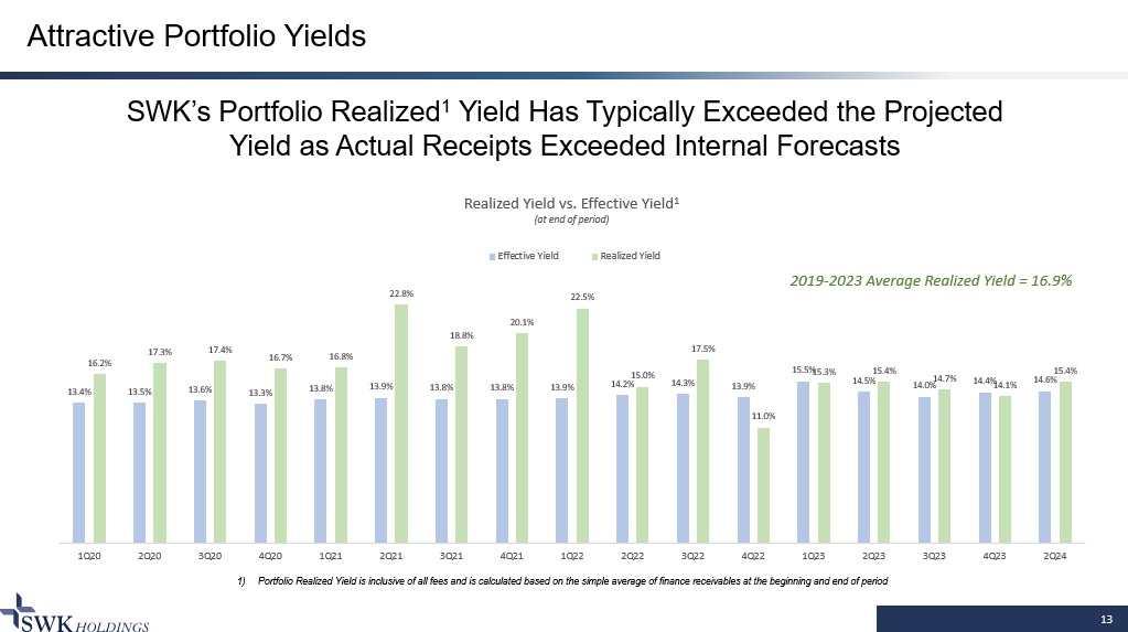 12 Attractive Portfolio Yields SWK Targets Low - to - Mid Teens Effective Yields 1 2Q24 Finance Segment Effective Yield was 14.6% 1) Effective yield is the rate at which income is expected to be recognized pursuant to the Company’s revenue recognition polici es, if all payments are received pursuant to the terms of the finance receivable; excludes warrants $180.9 $182.3 $187.0 $212.4 $219.0 $213.0 $206.2 $189.6 $195.8 $181.4 $222.2 $237.9 $249.6 $235.6 $236.3 $290.2 $280.1 13.4% 13.5% 13.6% 13.3% 13.8% 13.9% 13.8% 13.8% 13.9% 14.2% 14.3% 13.9% 15.5% 14.5% 14.0% 14.4% 14.6% 1Q20 2Q20 3Q20 4Q20 1Q21 2Q21 3Q21 4Q21 1Q22 2Q22 3Q22 4Q22 1Q23 2Q23 3Q23 4Q23 2Q24 Gross Investments Assets and Weighted Effective Yield ($ in millions) Total Investments Assets Portfolio Effective Yield