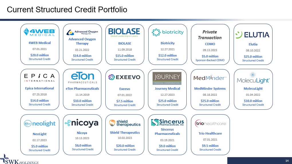 Current Structured Credit Portfolio MolecuLight 01.04.2022 $10.0 million Structured Credit Trio Healthcare 07.01.2021 $9.5 million Structured Credit Biotricity 12.27.2021 $12.0 million Structured Credit Epica International 07.25.2018 $14.0 million Structured Credit NeoLight 02.17.2023 $5.0 million Structured Credit 14 4WEB Medical 07.01.2021 $20.0 million Structured Credit eTon Pharmaceuticals 11.14.2019 $10.0 million Structured Credit Nicoya 10.1 3 .2023 $ 6 .0 million Structured Credit Advanced Oxygen Therapy 03.21.2022 $14.0 million Structured Credit Exeevo 07.01.2022 $7.5 million Structured Credit Shield Therapeu ti cs 10. 02 .2023 $20.0 million Structured Credit BIOLASE 11.09.2018 $15.0 million Structured Credit MedMinder Systems 08.18.2022 $25.0 million Structured Credit CDMO 09.13.2023 $5.0 million Sponsor - Backed CDMO Private Transaction Sincerus Pharmaceuticals 03.19.2021 $9.0 million Structured Credit Elutia 08.10.2022 $25.0 million Structured Credit Journey Medical 12.27.2023 $25.0 million Structured Credit
