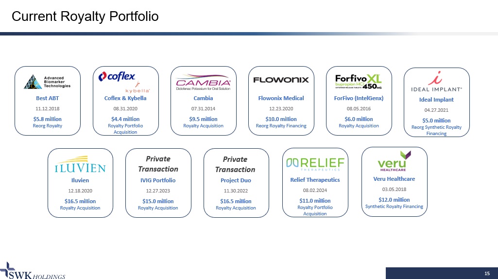 15 Current Royalty Portfolio Relief Therapeutics 08.02.2024 $11.0 million Royalty Portfolio Acquisition Iluvien 12.18.2020 $16.5 million Royalty Acquisition ForFivo (IntelGenx) 08.05.2016 $6.0 million Royalty Acquisition Ideal Implant 04.27.2021 $5.0 million Reorg Synthetic Royalty Financing Best ABT 11.12.2018 $5.8 million Reorg Royalty Coflex & Kybella 08.31.2020 $4.4 million Royalty Portfolio Acquisition Cambia 07.31.2014 $9.5 million Royalty Acquisition Project Duo 11.30.2022 $16.5 million Royalty Acquisition Private Transaction Flowonix Medical 12.23.2020 $10.0 million Reorg Royalty Financing IVIG Portfolio 12.27.2023 $15.0 million Royalty Acquisition Private Transaction Veru Healthcare 03.05.2018 $12.0 million Synthetic Royalty Financing