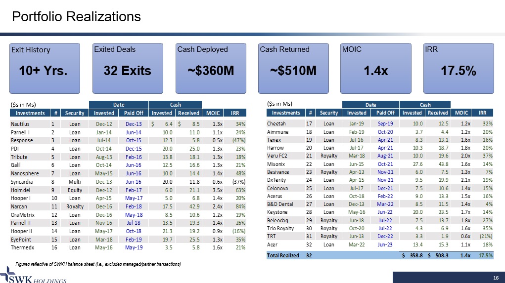($s in Ms) Date Cash Investments # Security Invested Paid Off Invested Received MOIC IRR Cheetah 17 Loan Jan-19 Sep-19 10.0 12.5 1.2x 32% Aimmune 18 Loan Feb-19 Oct-20 3.7 4.4 1.2x 20% Tenex 19 Loan Jul-16 Apr-21 8.3 13.1 1.6x 16% Harrow 20 Loan Jul-17 Apr-21 10.3 18.7 1.8x 20% Veru FC2 21 Royalty Mar-18 Aug-21 10.0 19.6 2.0x 37% Misonix 22 Loan Jun-15 Oct-21 27.6 43.8 1.6x 14% Besivance 23 Royalty Apr-13 Nov-21 6.0 7.5 1.3x 7% DxTerity 24 Loan Apr-15 Nov-21 9.5 19.9 2.1x 19% Celonova 25 Loan Jul-17 Dec-21 7.5 10.6 1.4x 15% Acerus 26 Loan Oct-18 Feb-22 9.0 13.3 1.5x 16% B&D Dental 27 Loan Dec-13 Mar-22 8.5 11.5 1.4x 4% Keystone 28 Loan May-16 Jun-22 20.0 33.5 1.7x 14% Beleodaq 29 Royalty Jun-18 Jul-22 7.5 13.7 1.8x 27% Trio Royalty 30 Royalty Oct-20 Jul-22 4.3 6.9 1.6x 35% TRT 31 Royalty Jun-13 Dec-22 3.3 1.9 0.6x (21%) Acer 32 Loan Mar-22 Jun-23 13.4 15.3 1.1x 18% Total Realized 32 358.8$ 508.3$ 1.4x 17.5% ($s in Ms) Date Cash Investments # Security Invested Paid Off Invested Received MOIC IRR Nautilus 1 Loan Dec-12 Dec-13 6.4$ 8.5$ 1.3x 34% Parnell I 2 Loan Jan-14 Jun-14 10.0 11.0 1.1x 24% Response 3 Loan Jul-14 Oct-15 12.3 5.8 0.5x (47%) PDI 4 Loan Oct-14 Dec-15 20.0 25.0 1.3x 23% Tribute 5 Loan Aug-13 Feb-16 13.8 18.1 1.3x 18% Galil 6 Loan Oct-14 Jun-16 12.5 16.6 1.3x 21% Nanosphere 7 Loan May-15 Jun-16 10.0 14.4 1.4x 48% Syncardia 8 Multi Dec-13 Jun-16 20.0 11.8 0.6x (37%) Holmdel 9 Equity Dec-12 Feb-17 6.0 21.1 3.5x 63% Hooper I 10 Loan Apr-15 May-17 5.0 6.8 1.4x 20% Narcan 11 Royalty Dec-16 Feb-18 17.5 42.9 2.4x 84% OraMetrix 12 Loan Dec-16 May-18 8.5 10.6 1.2x 19% Parnell II 13 Loan Nov-16 Jul-18 13.5 19.3 1.4x 26% Hooper II 14 Loan May-17 Oct-18 21.3 19.2 0.9x (16%) EyePoint 15 Loan Mar-18 Feb-19 19.7 25.5 1.3x 35% Thermedx 16 Loan May-16 May-19 3.5 5.8 1.6x 21% 16 Portfolio Realizations Exit History 10+ Yrs. Exited Deals 32 Exits Cash Deployed ~$360M Cash Returned ~$510M MOIC 1.4x IRR 17.5% Figures reflective of SWKH balance sheet (i . e . , excludes managed/partner transactions) ($s in Ms) ($s in Ms)