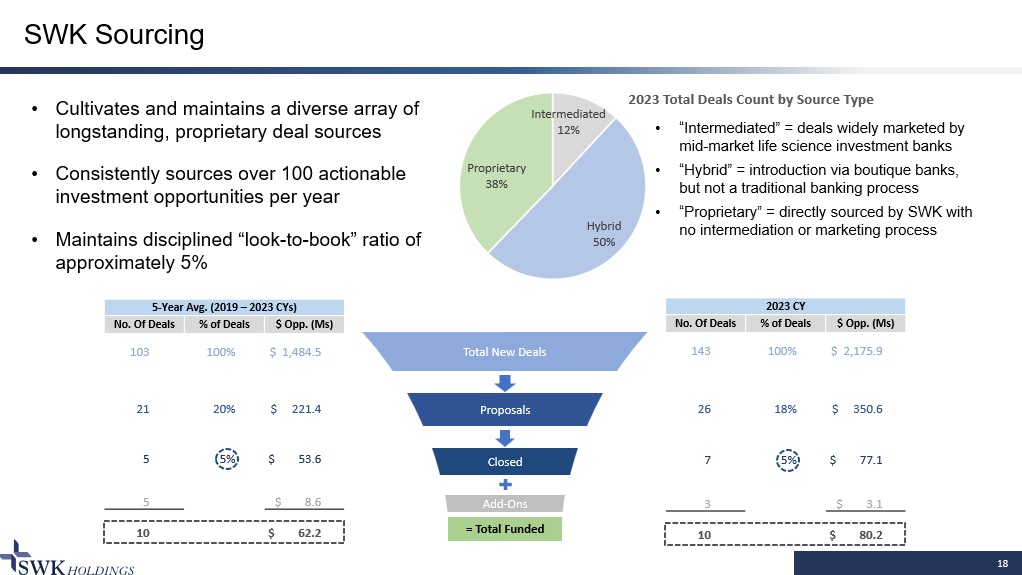 17 Portfolio Realizations to Strategic Buyers 13 realizations to strategic buyers demonstrated a median 28% LTV of SWK’s original loan value 9 of the 13 businesses were not profitable at time of sale, validating SWK’s revenue and IP - based underwriting methodology 1) Attachment point measured as face value of loan and inclusive of all subsequent add - ons and any pari or senior debt outstanding at exit 2) Averages weighted to SWK attachment point or cash invested basis ($ in M) Target Buyer Close Date Transaction TEV SWK Attachment Point 1 SWK Attach / Transaction EV LTM Sales EV / LTM Sales Target Profitable Sale? Notes Nautilus Depomed Dec-13 48.7$ 22.5$ 46% 15.4$ 3.2x N Key asset was Cambia Response Genetics Cancer Genetics Oct-15 5.8 12.3 212% 16.7$ 0.3x N PDI Publicis Dec-15 33.0 20.0 61% 129.3$ 0.3x Y CSO division only; Transaction EV assumes 50% near-term earn-outs achieved Tribute Aralez Feb-16 147.6 13.8 9% 26.5$ 5.6x N Galil BTG plc May-16 84.4 12.5 15% 22.7$ 3.7x N Transaction EV excludes $26M of milestones Nanosphere Luminex Jun-16 77.0 25.0 32% 23.1$ 3.3x N Holmdel ANI Pharma Feb-17 30.5 6.0 28% 11.1$ 2.7x Y Key asset was InnoPran XL Orametrix Dentsply Sirona May-18 90.0 8.5 9% 20.0$ 4.5x Y Transaction EV excludes up to $60M in earn-outs Hooper II Quest Oct-18 27.8 21.3 77% 61.3$ 0.5x N Loan value includes non-SWK revolver ($8M); Workout fees totaled $4M Cheetah Medical Baxter Oct-19 190.0 20.0 11% 22.2$ 8.6x N Transaction EV excludes up to $40M in earn-outs Aimmune Nestle Oct-20 2,139.0 131.5 6% n.a. n.a. N SWK partnered with KKR on the transaction as a 4.5% participant Tenex Trice Apr-21 25.0 8.3 33% 12.3$ 2.0x Y Excludes earn-outs Misonix Bioventus Oct-21 518.0$ 27.6$ 5% 74.0$ 7.0x N Weighted Average 2 191.6$ 28.3% 3.4x ($s in Ms)