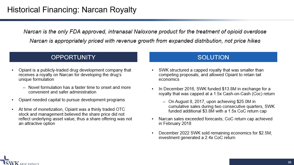 Historical Financing: Narcan Royalty 20 OPPORTUNITY SOLUTION • Opiant is a publicly - traded drug development company that receives a royalty on Narcan for developing the drug’s unique formulation – Novel formulation has a faster time to onset and more convenient and safer administration • Opiant needed capital to pursue development programs • At time of monetization, Opiant was a thinly traded OTC stock and management believed the share price did not reflect underlying asset value, thus a share offering was not an attractive option • SWK structured a capped royalty that was smaller than competing proposals, and allowed Opiant to retain tail economics • In December 2016, SWK funded $13.8M in exchange for a royalty that was capped at a 1.5x Cash - on - Cash (Coc) return – On August 8, 2017, upon achieving $25.0M in cumulative sales during two consecutive quarters, SWK funded additional $3.8M with a 1.5x CoC return cap • Narcan sales exceeded forecasts; CoC return cap achieved in February 2018 • December 2022 SWK sold remaining economics for $2.5M; investment generated a 2.4x CoC return Narcan is the only FDA approved, intranasal Naloxone product for the treatment of opioid overdose Narcan is appropriately priced with revenue growth from expanded distribution, not price hikes