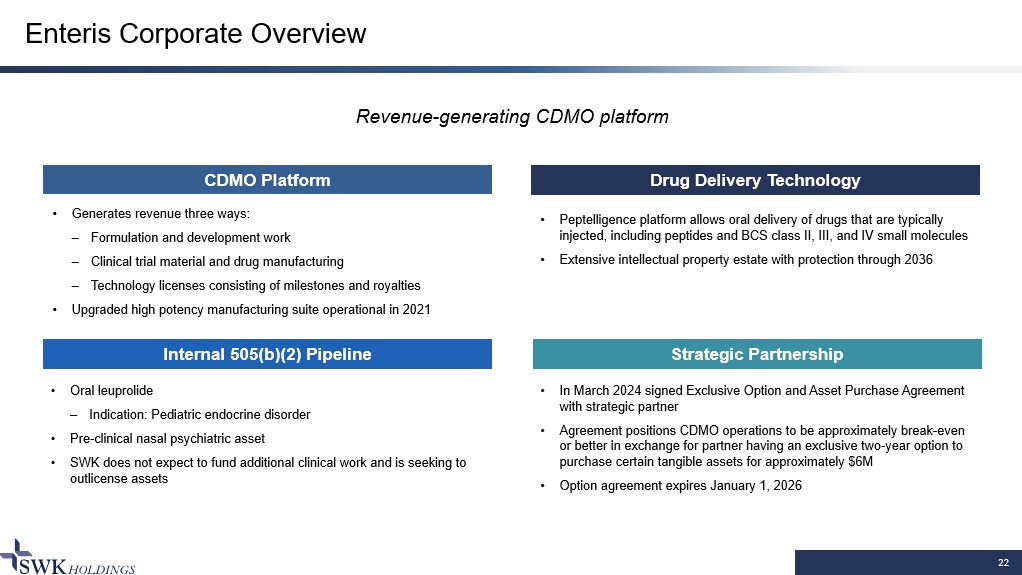 22 Enteris Corporate Overview CDMO Platform Revenue - generating CDMO platform Drug Delivery Technology Internal 505(b)(2) Pipeline Strategic Partnership • Peptelligence platform allows oral delivery of drugs that are typically injected, including peptides and BCS class II, III, and IV small molecules • Extensive intellectual property estate with protection through 2036 • Generates revenue three ways: – Formulation and development work – Clinical trial material and drug manufacturing – Technology licenses consisting of milestones and royalties • Upgraded high potency manufacturing suite operational in 2021 • Oral leuprolide – Indication: Pediatric endocrine disorder • Pre - clinical nasal psychiatric asset • SWK does not expect to fund additional clinical work and is seeking to outlicense assets • In March 2024 signed Exclusive Option and Asset Purchase Agreement with strategic partner • Agreement positions CDMO operations to be approximately break - even or better in exchange for partner having an exclusive two - year option to purchase certain tangible assets for approximately $6M • Option agreement expires January 1, 2026