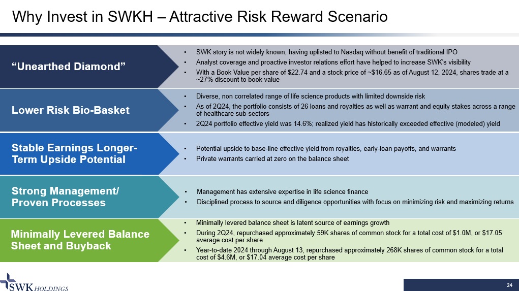 Why Invest in SWKH – Attractive Risk Reward Scenario 24 Minimally Levered Balance Sheet and Buyback • SWK story is not widely known, having uplisted to Nasdaq without benefit of traditional IPO • Analyst coverage and proactive investor relations effort have helped to increase SWK’s visibility • With a Book Value per share of $22.74 and a stock price of ~$16.65 as of August 12, 2024, shares trade at a ~27% discount to book value Strong Management/ Proven Processes Stable Earnings Longer - Term Upside Potential Lower Risk Bio - Basket “Unearthed Diamond” • Diverse, non correlated range of life science products with limited downside risk • As of 2Q24, the portfolio consists of 26 loans and royalties as well as warrant and equity stakes across a range of healthcare sub - sectors • 2Q24 portfolio effective yield was 14.6%; realized yield has historically exceeded effective (modeled) yield • Potential upside to base - line effective yield from royalties, early - loan payoffs, and warrants • Private warrants carried at zero on the balance sheet • Management has extensive expertise in life science finance • Disciplined process to source and diligence opportunities with focus on minimizing risk and maximizing returns • Minimally levered balance sheet is latent source of earnings growth • During 2Q24, repurchased approximately 59K shares of common stock for a total cost of $1.0M, or $17.05 average cost per share • Year - to - date 2024 through August 13, repurchased approximately 268K shares of common stock for a total cost of $4.6M, or $17.04 average cost per share