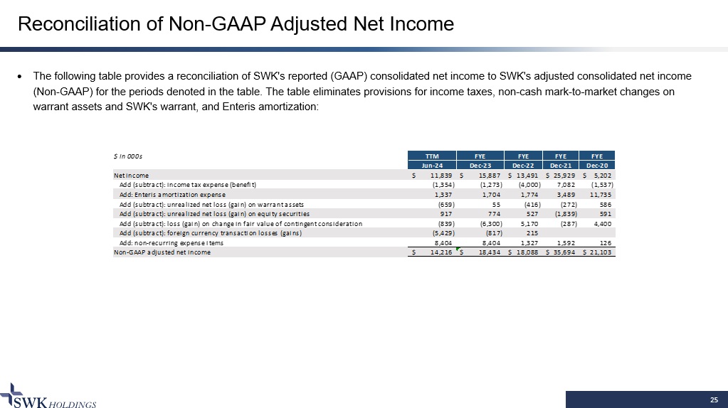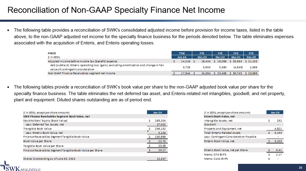 25 Reconciliation of Non - GAAP Adjusted Net Income The following table provides a reconciliation of SWK's reported (GAAP) consolidated net income to SWK's adjusted consolidated ne t income (Non - GAAP) for the periods denoted in the table. The table eliminates provisions for income taxes, non - cash mark - to - market chang es on warrant assets and SWK's warrant, and Enteris amortization: $ in 000s TTM FYE FYE FYE FYE Jun-24 Dec-23 Dec-22 Dec-21 Dec-20 Net income 11,839$ 15,887$ 13,491$ 25,929$ 5,202$ Add (subtract): income tax expense (benefit) (1,354) (1,273) (4,000) 7,082 (1,537) Add: Enteris amortization expense 1,337 1,704 1,774 3,489 11,735 Add (subtract): unrealized net loss (gain) on warrant assets (659) 55 (416) (272) 586 Add (subtract): unrealized net loss (gain) on equity securities 917 774 527 (1,839) 591 Add (subtract): loss (gain) on change in fair value of contingent consideration (839) (6,300) 5,170 (287) 4,400 Add (subtract): foreign currency transaction losses (gains) (5,429) (817) 215 Add: non-recurring expense items 8,404 8,404 1,327 1,592 126 Non-GAAP adjusted net income 14,216$ 18,434$ 18,088$ 35,694$ 21,103$