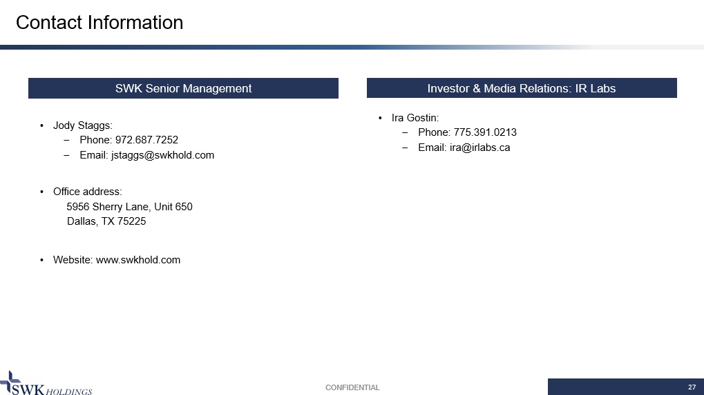 27 Contact Information CONFIDENTIAL SWK Senior Management Investor & Media Relations: IR Labs • Jody Staggs: ̶ Phone: 972.687.7252 ̶ Email: jstaggs@swkhold.com • Office address: 5956 Sherry Lane, Unit 650 Dallas, TX 75225 • Website: www.swkhold.com • Ira Gostin : ̶ Phone : 775.391.0213 ̶ Email: ira@irlabs.ca