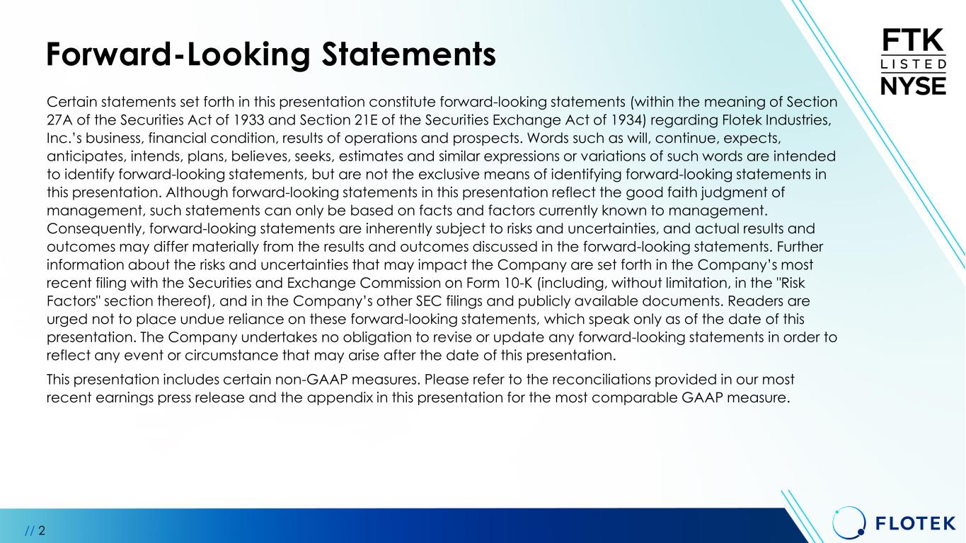 Forward-Looking Statements Certain statements set forth in this presentation constitute forward-looking statements (within the meaning of Section 27A of the Securities Act of 1933 and Section 21E of the Securities Exchange Act of 1934) regarding Flotek Industries, Inc.’s business, financial condition, results of operations and prospects. Words such as will, continue, expects, anticipates, intends, plans, believes, seeks, estimates and similar expressions or variations of such words are intended to identify forward-looking statements, but are not the exclusive means of identifying forward-looking statements in this presentation. Although forward-looking statements in this presentation reflect the good faith judgment of management, such statements can only be based on facts and factors currently known to management. Consequently, forward-looking statements are inherently subject to risks and uncertainties, and actual results and outcomes may differ materially from the results and outcomes discussed in the forward-looking statements. Further information about the risks and uncertainties that may impact the Company are set forth in the Company’s most recent filing with the Securities and Exchange Commission on Form 10-K (including, without limitation, in the "Risk Factors" section thereof), and in the Company’s other SEC filings and publicly available documents. Readers are urged not to place undue reliance on these forward-looking statements, which speak only as of the date of this presentation. The Company undertakes no obligation to revise or update any forward-looking statements in order to reflect any event or circumstance that may arise after the date of this presentation. This presentation includes certain non-GAAP measures. Please refer to the reconciliations provided in our most recent earnings press release and the appendix in this presentation for the most comparable GAAP measure. // 2
